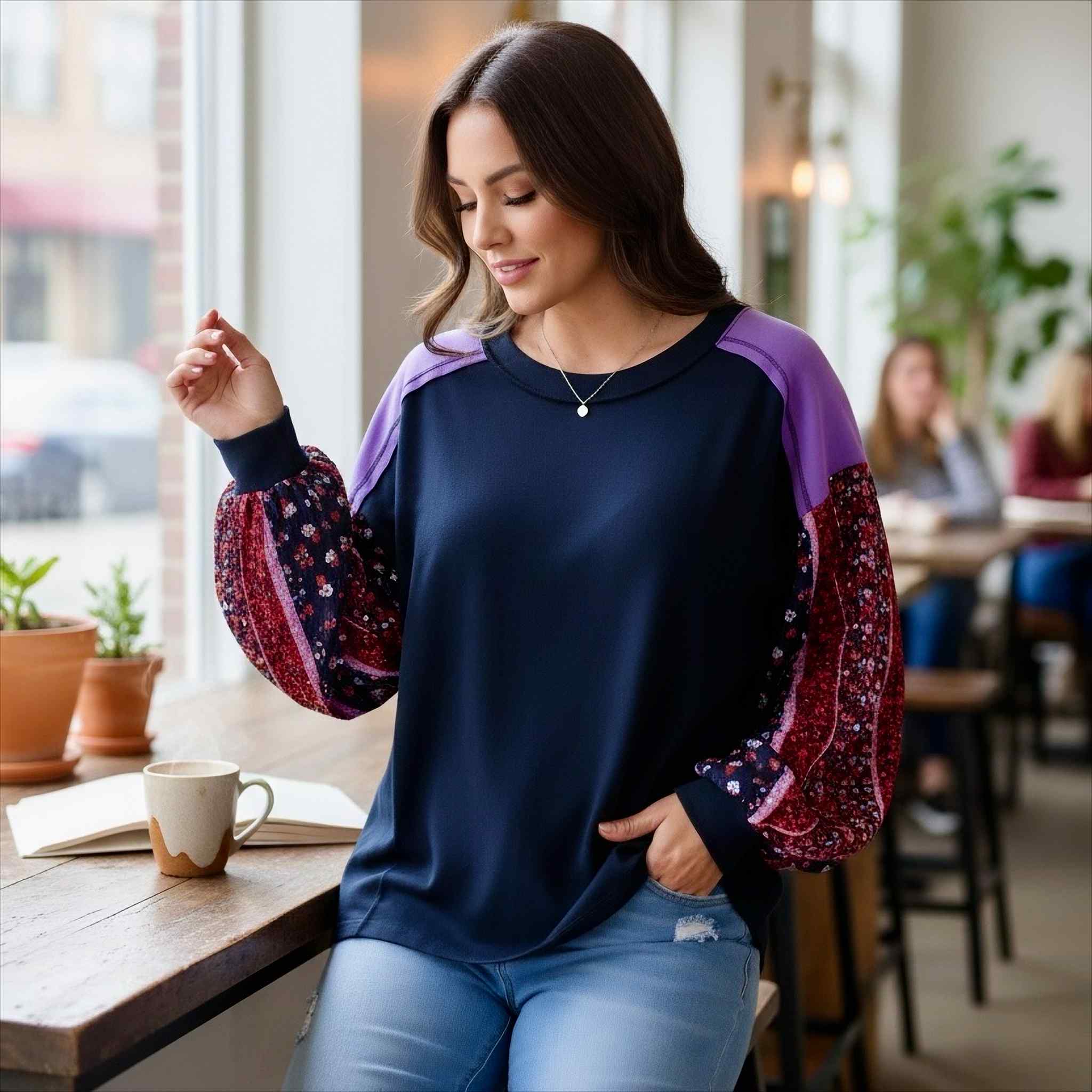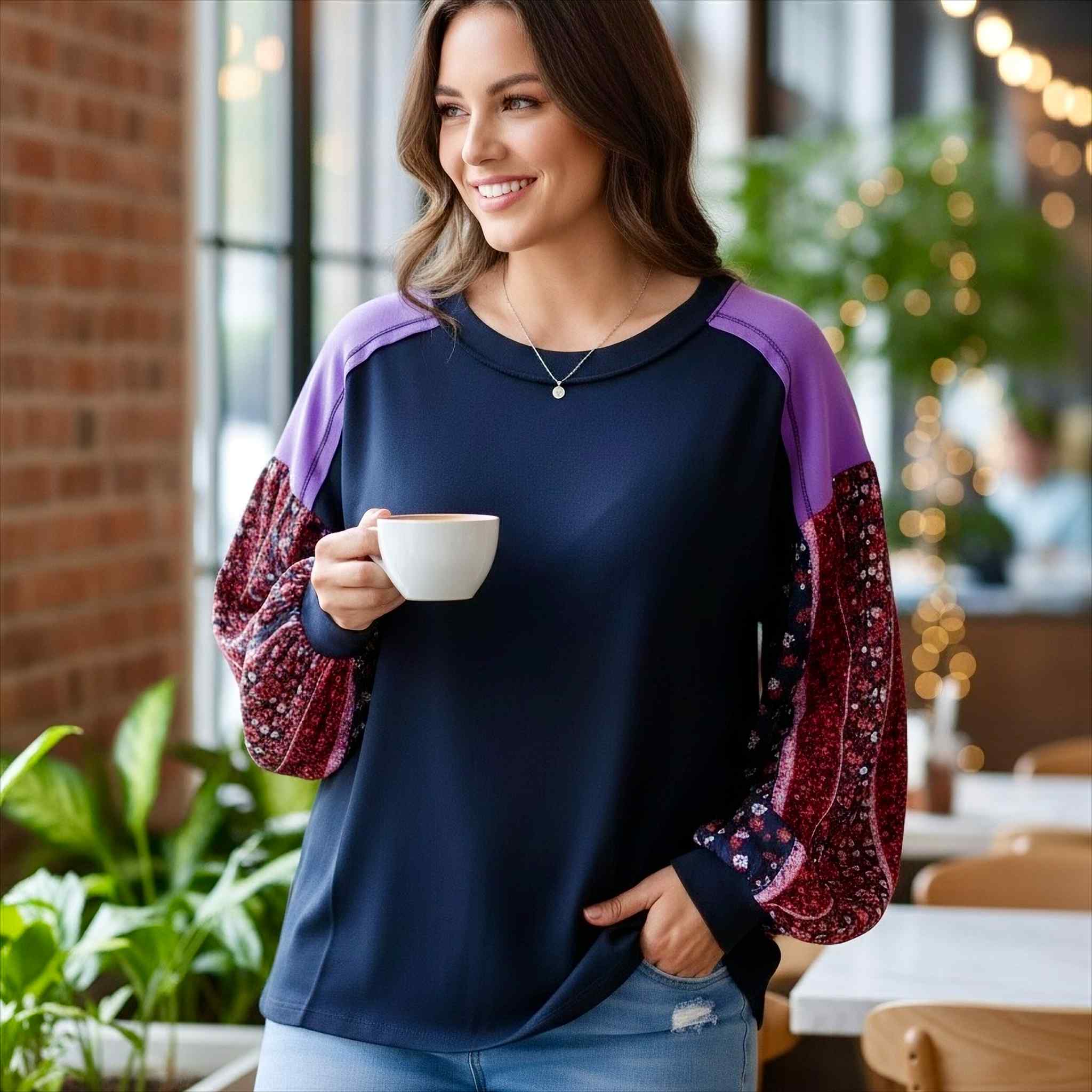 Layer with a navy, wine, or cream vest — stunning with the sleeve print