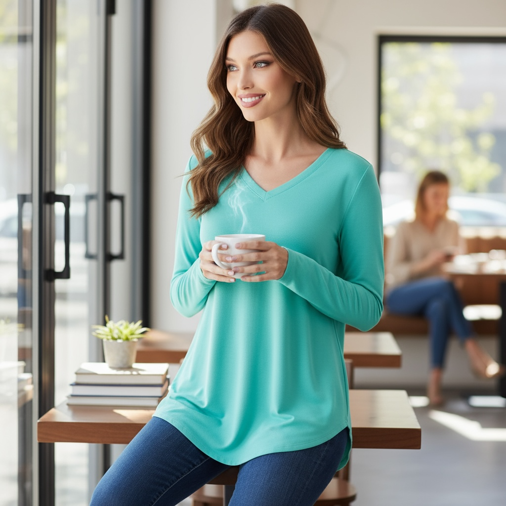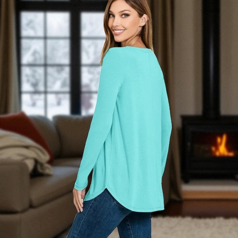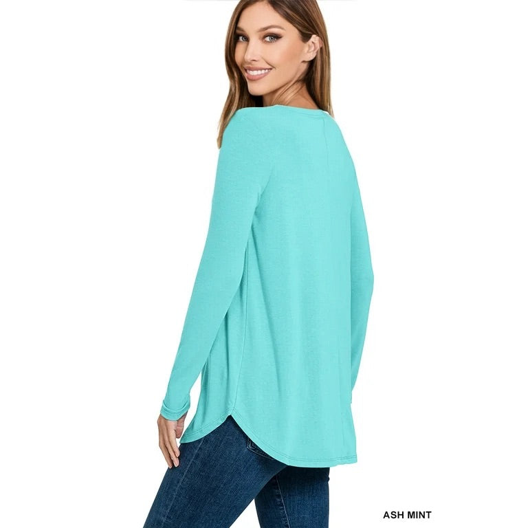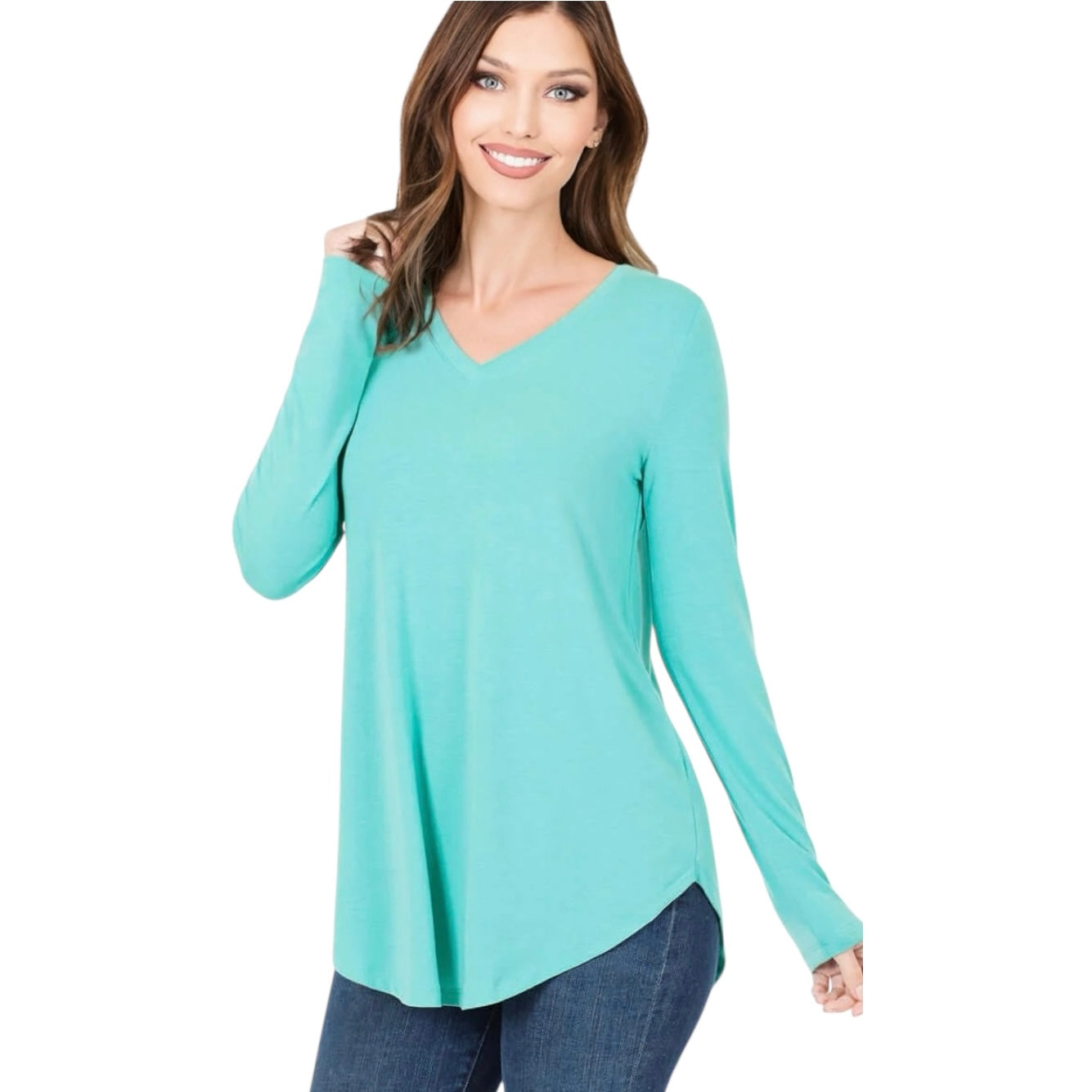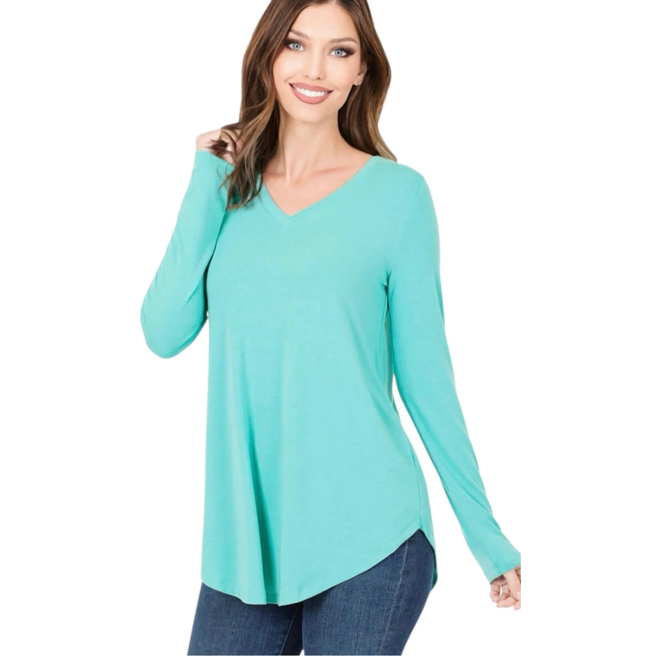 Indulge in the luxurious comfort of the Zenana TRANQUIL TRENDS Top (Mint). With its long sleeves, v-neck, round hem, and relaxed fit, this top is the perfect combination of a classic tee and high-quality construction. Made from the best materials, it is incredibly comfortable, stretchy, and super soft, making it the ideal addition to any wardrobe. Trust us, you won't want to take it off!