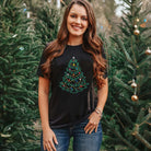 This t-shirt is sure to make a statement with its fully studded Christmas tree design! Made from soft cotton blend in a lightweight quality, it's versatile and can be easily styled with jeans, shorts, or skirts. Perfect for the fashion-conscious woman looking for a bit of sparkle and fun.