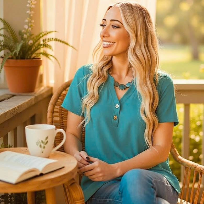 The relaxed, oversized silhouette pairs beautifully with jeans, shorts, or leggings, while the functional button detail at the neckline adds a hint of charm to this casual essential. Whether you’re running errands or relaxing with friends, this top keeps you cool, comfy, and confidently put-together.