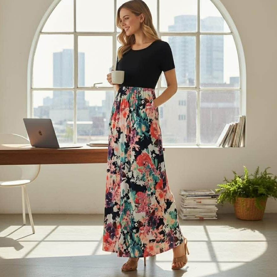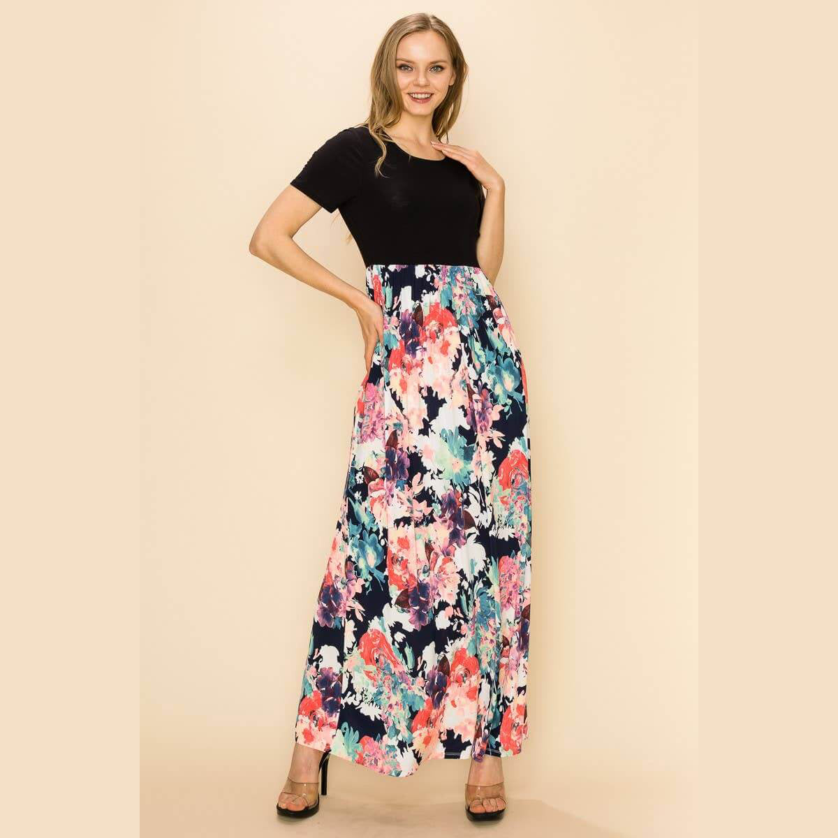 Bold meets beautiful in the Raven Radiance Maxi Dress — a stunning fusion of classic black and vibrant floral flair. This color-blocked maxi dress features a sleek black bodice that flows into a bold, watercolor floral skirt, giving you the perfect balance of modern contrast and feminine charm.