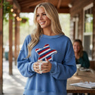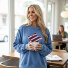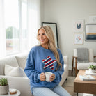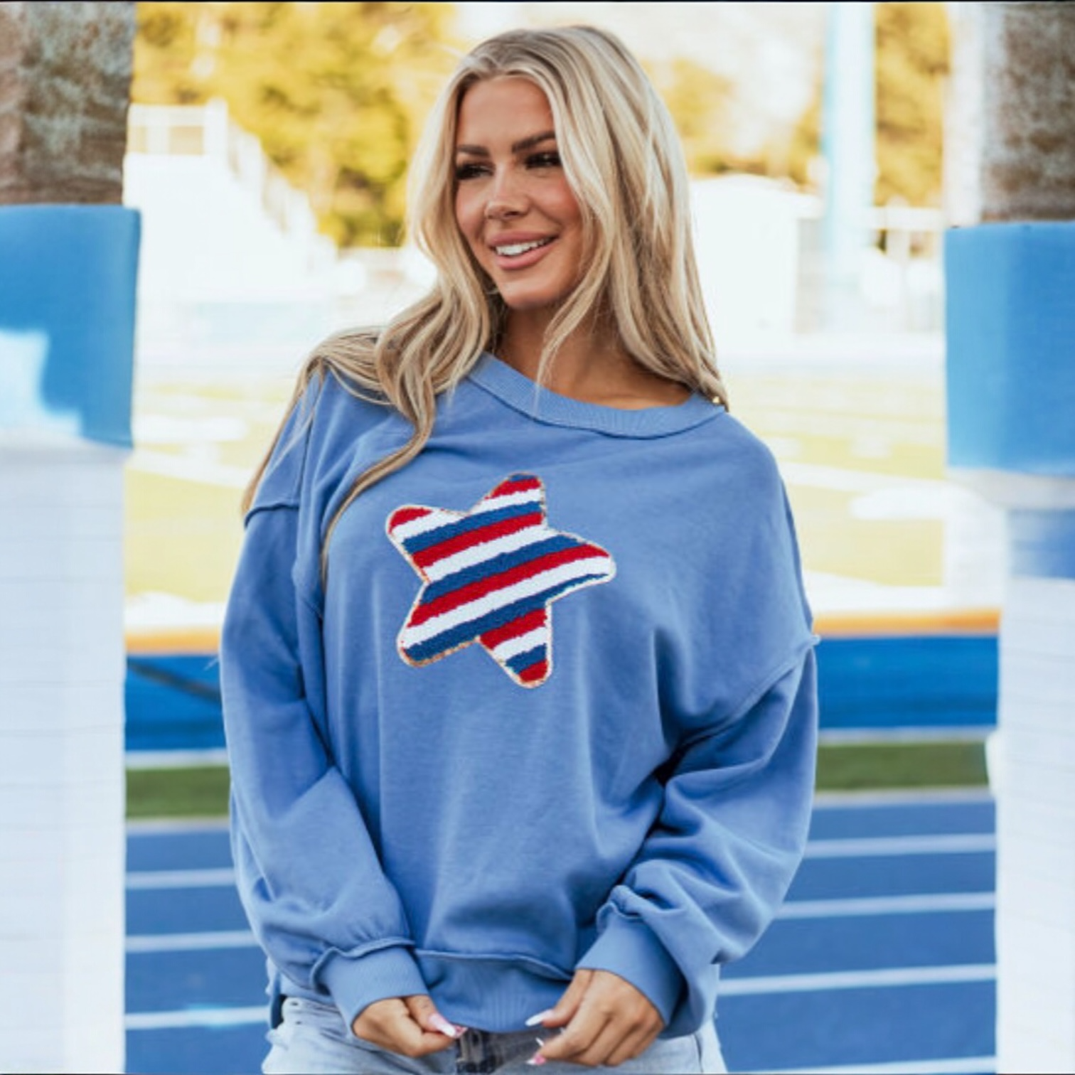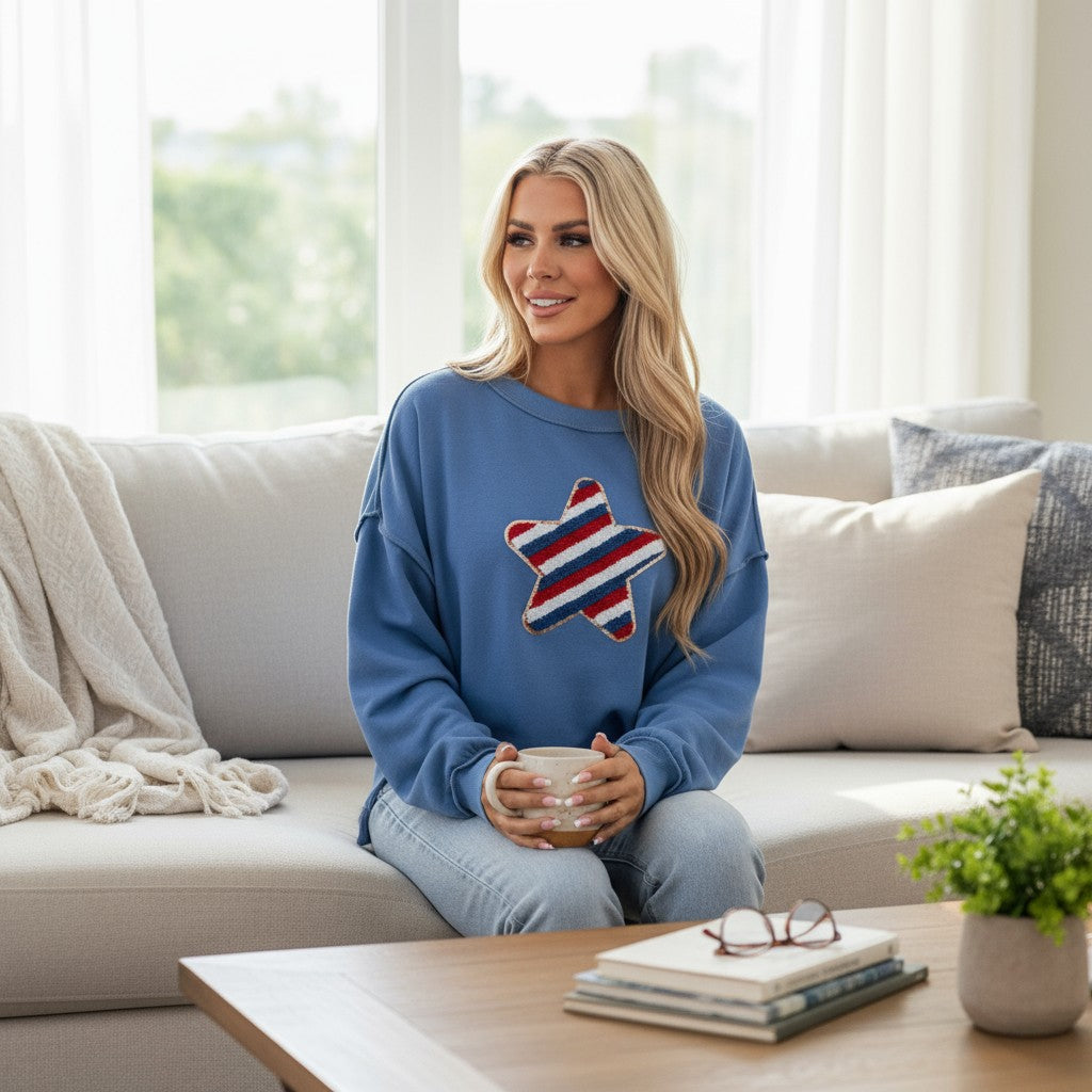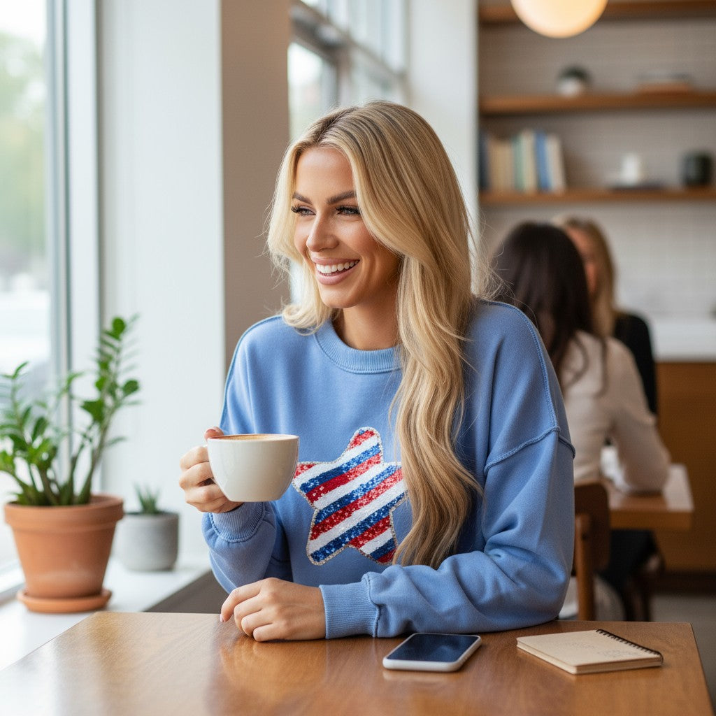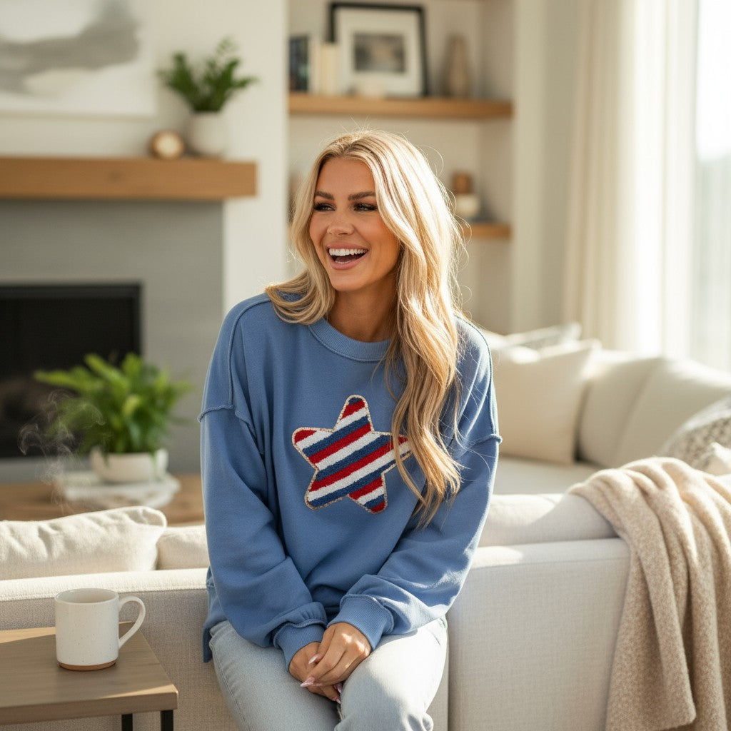 Show your patriotic spirit in style with our Star Academy Pullover, a cozy and eye-catching sweatshirt that blends comfort, sparkle, and USA pride. Featuring a sky blue base and a beautifully embroidered star design accented with shimmering sequin trim, this piece is made to shine at every backyard BBQ, summer night out, or festive holiday gathering.