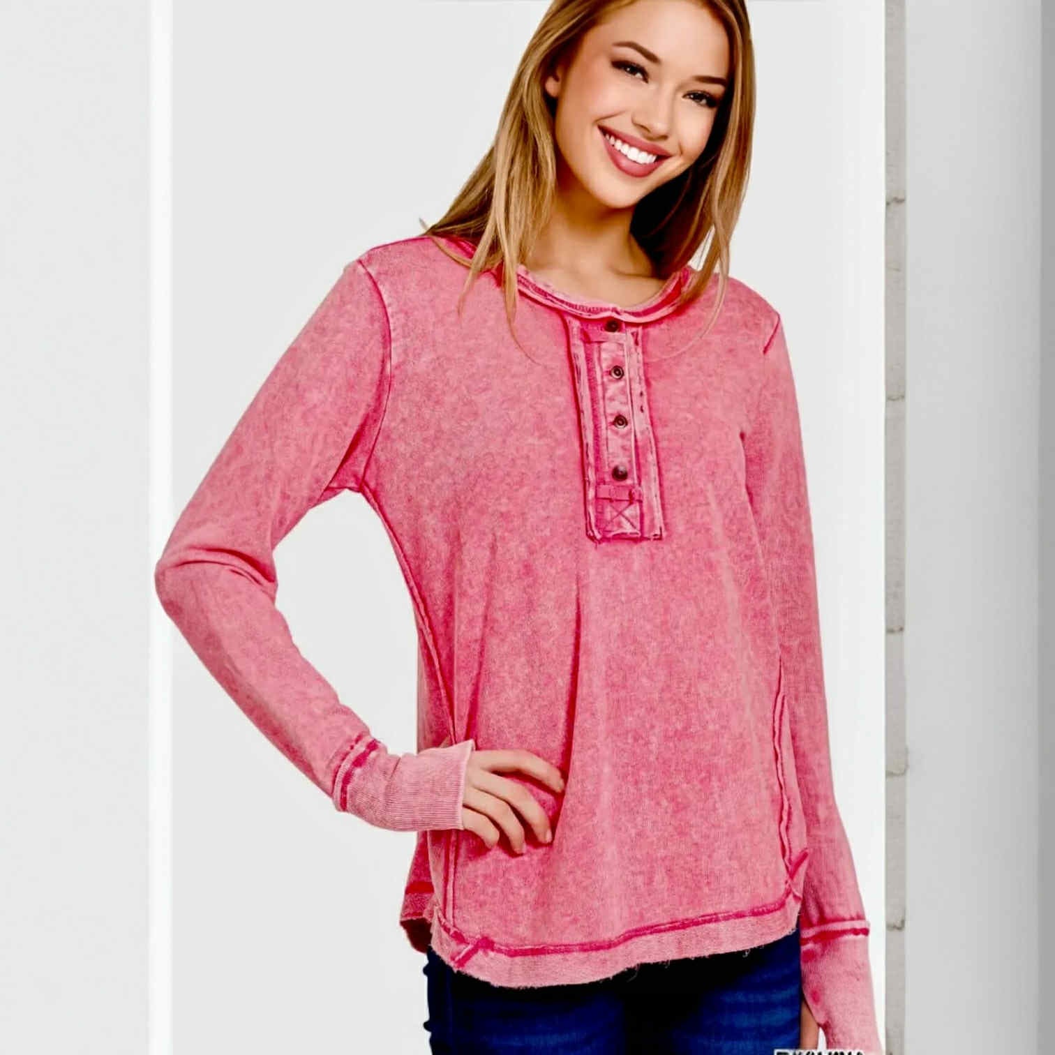 This beautifully crafted mineral wash top was made for those easygoing days when comfort meets style. Featuring a relaxed silhouette with unique raw edge details, it’s a true everyday essential that still feels special. The thumb hole cuffs add a cozy, casual touch while the scoop neckline and button-front design keep it effortlessly chic.