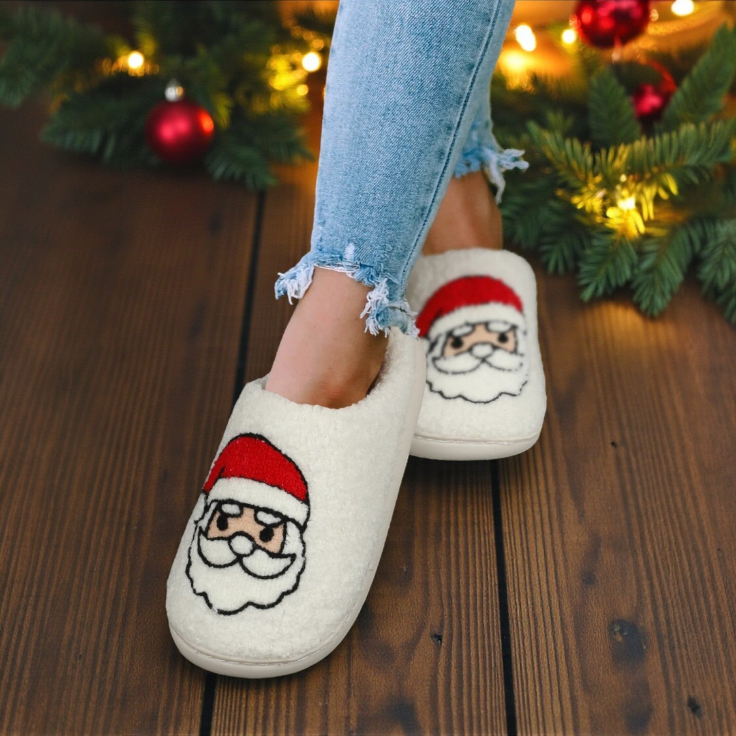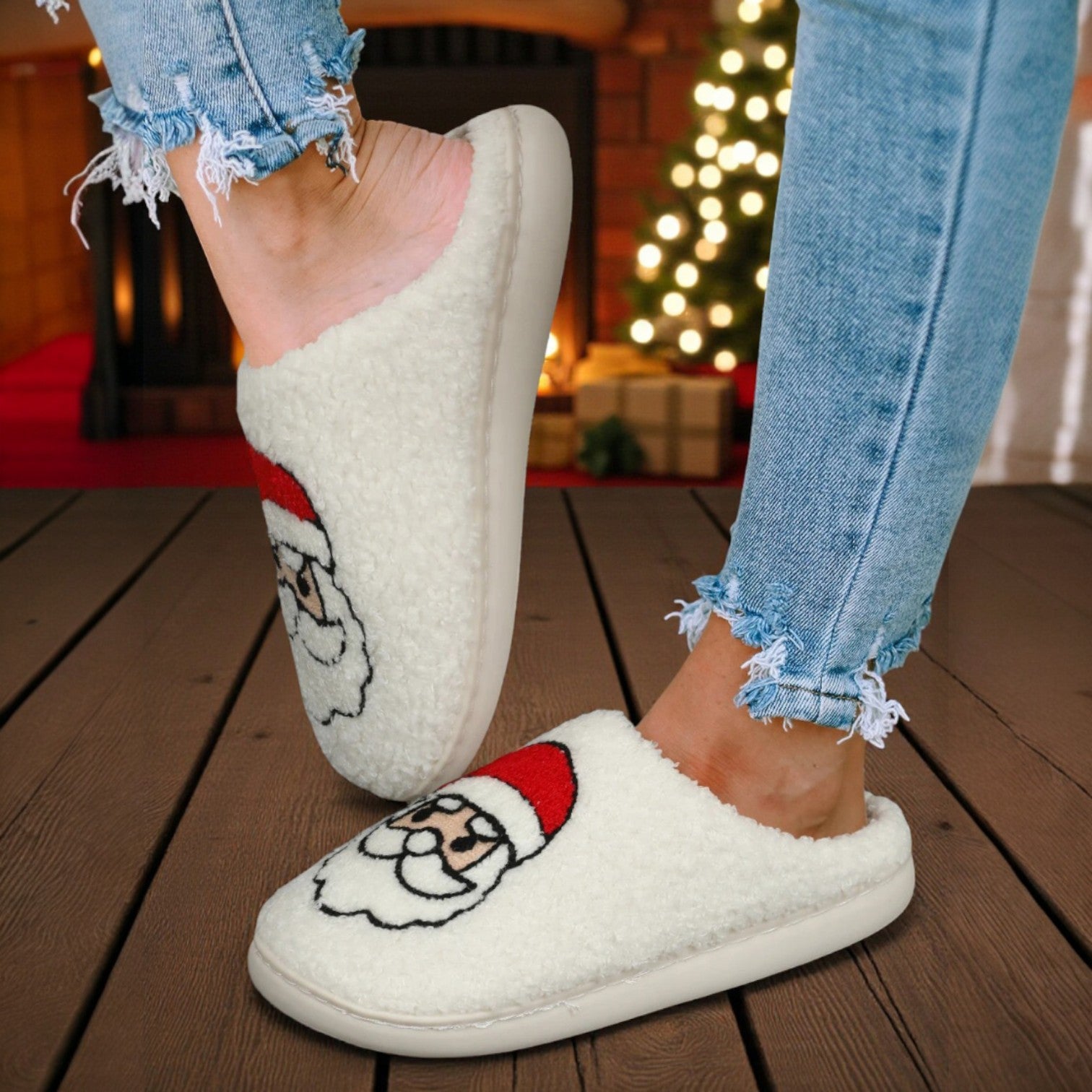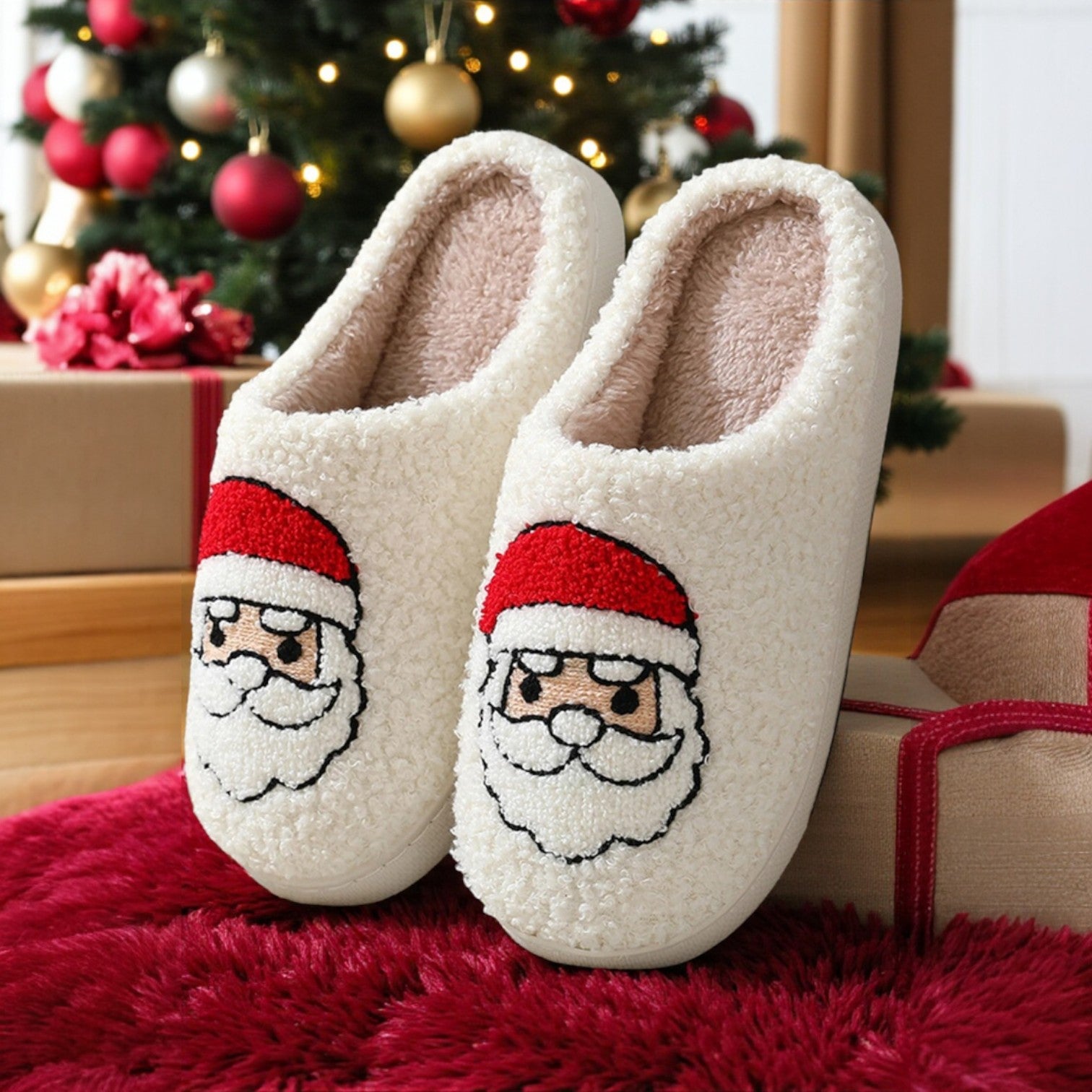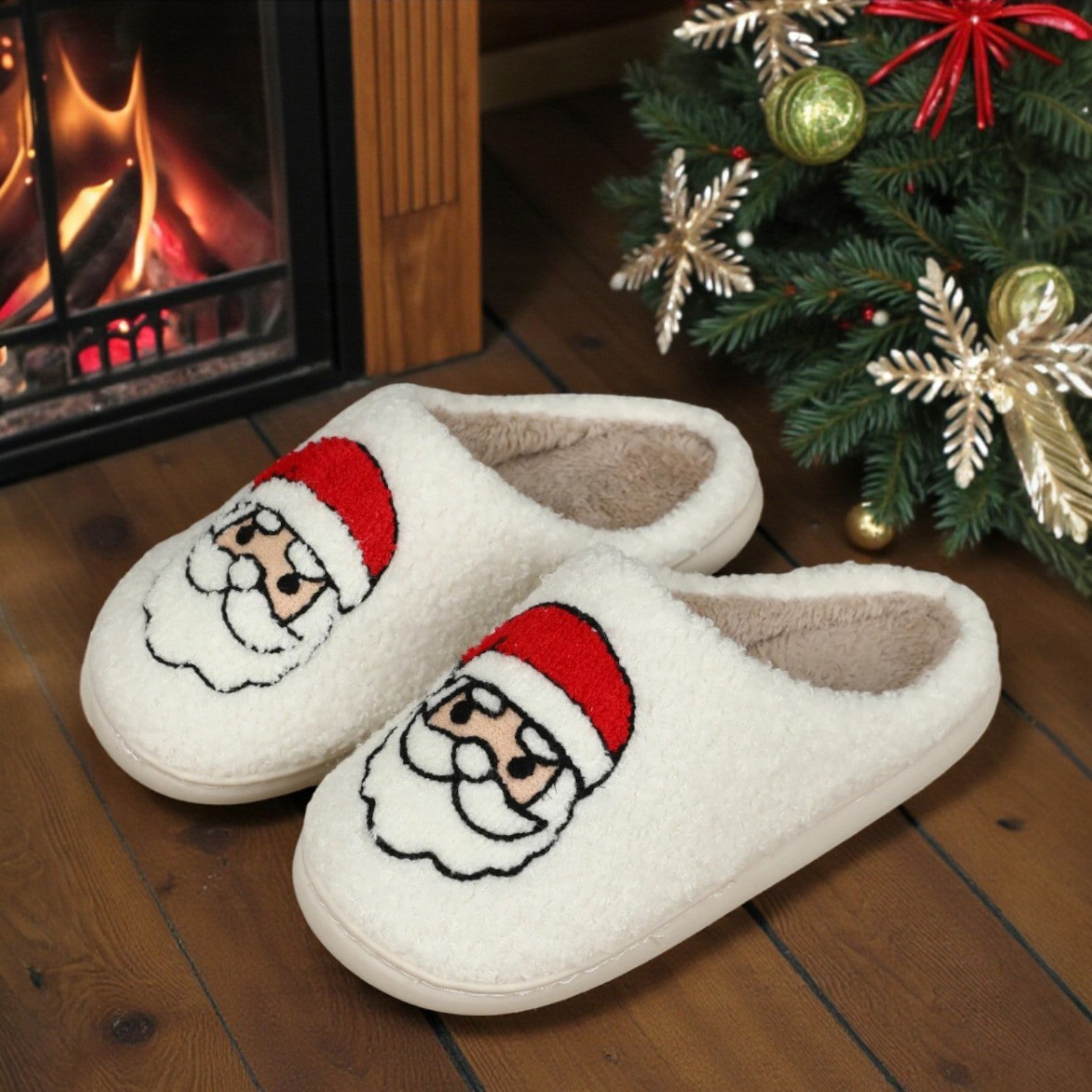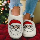 Cozy Claus Slippers – White Sherpa Plush Christmas Slippers