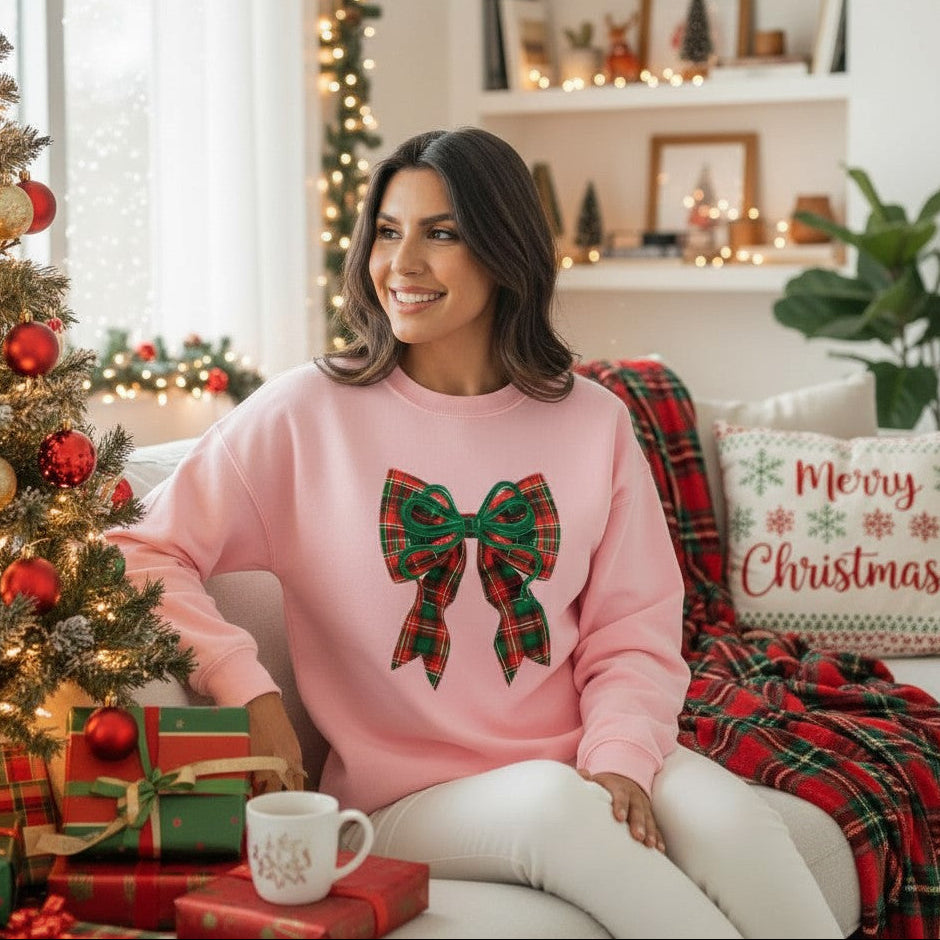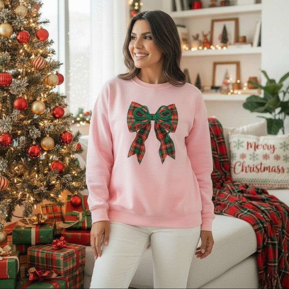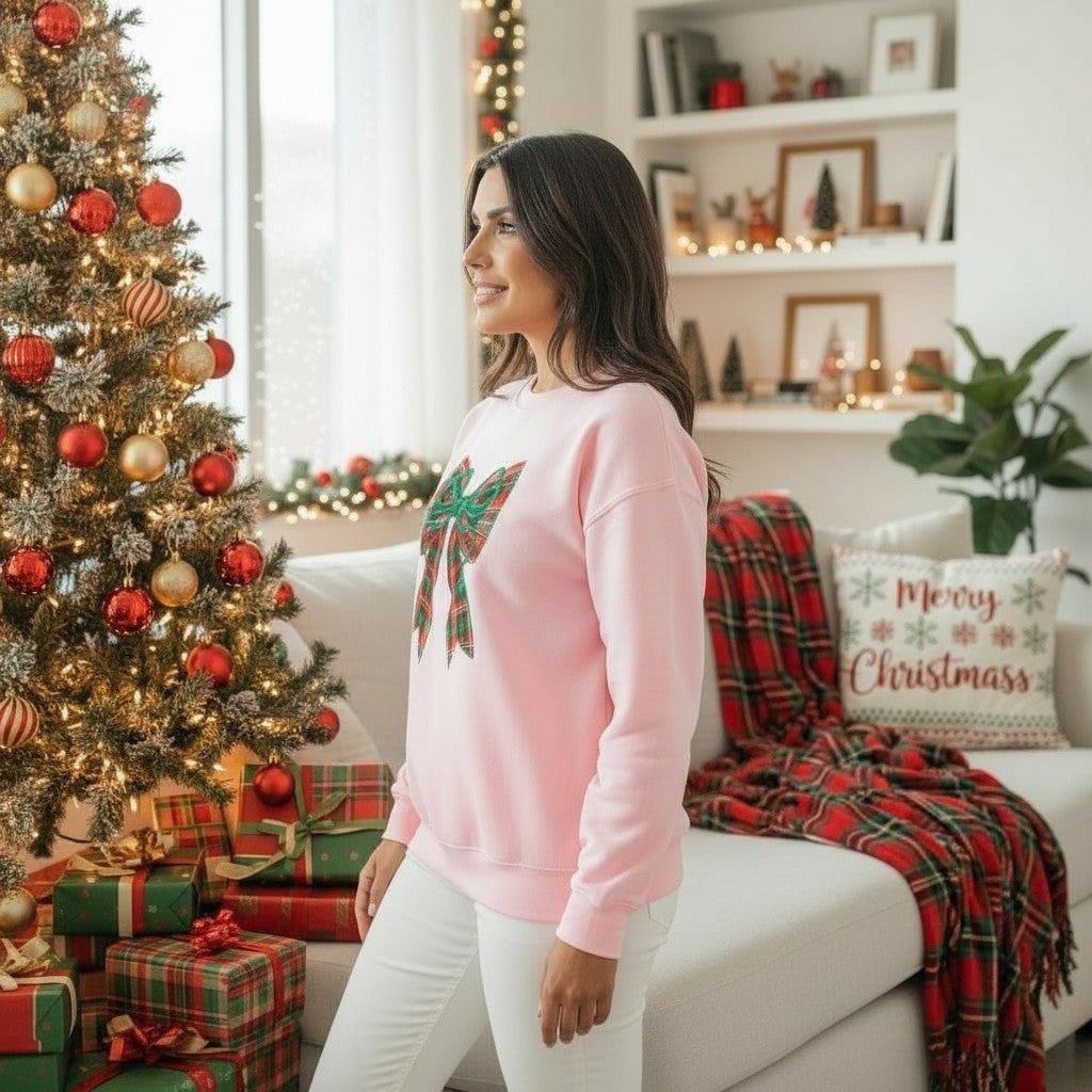 Wrapped to Perfection Pullover – Pink Plaid Bow Christmas Sweatshirt