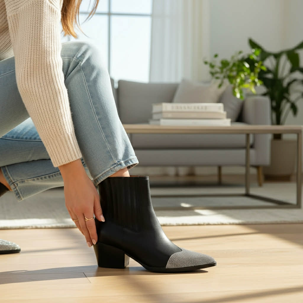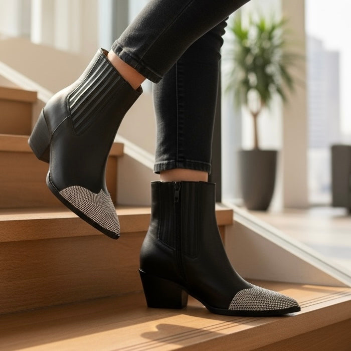 Add a sparkle to any outfit with our Rhinestone Cowgirl booties! The dazzling rhinestones on the toe cap catch attention and add a touch of chic to your step. The black finish brings effortless beauty, striking the perfect balance between elegance and glamour. Versatile for any occasion - a night out, the office, or a concert - these booties pair perfectly with denim, leggings, dresses, or skirts.