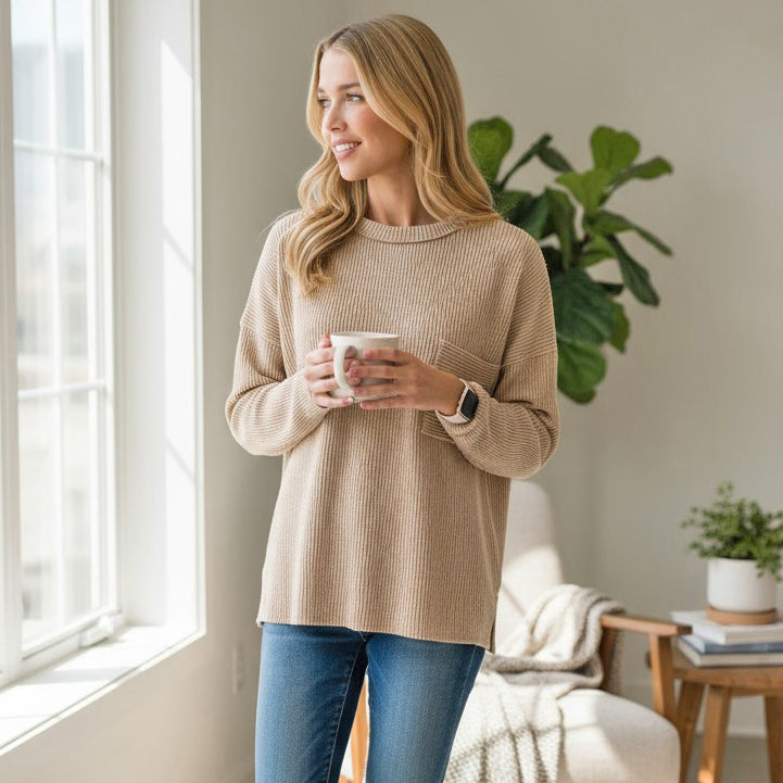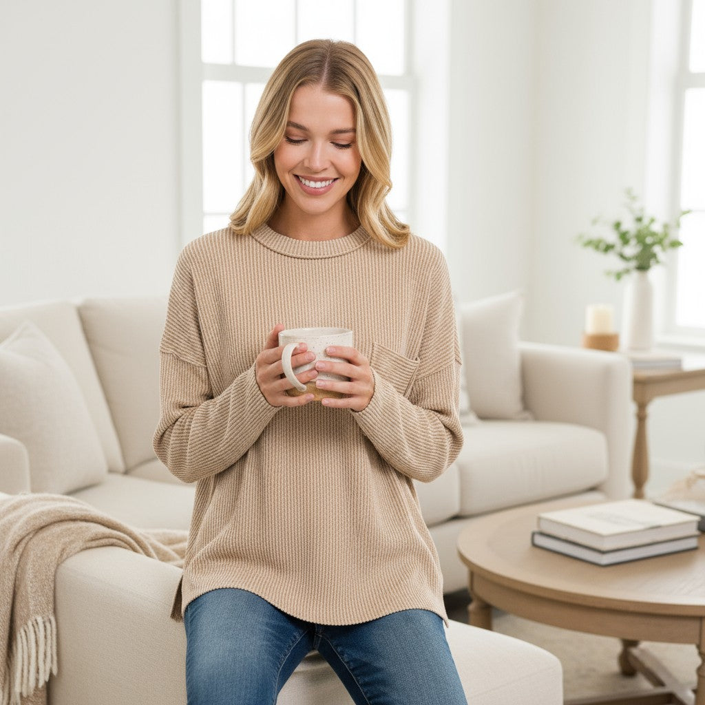 Wrap yourself in everyday ease with the Comfort Theory Top, your new go-to for cozy days and casual outings. Made from a wavy corded rib knit that’s buttery soft and breathable, this drop shoulder long sleeve top gives you that effortless relaxed look without sacrificing style.