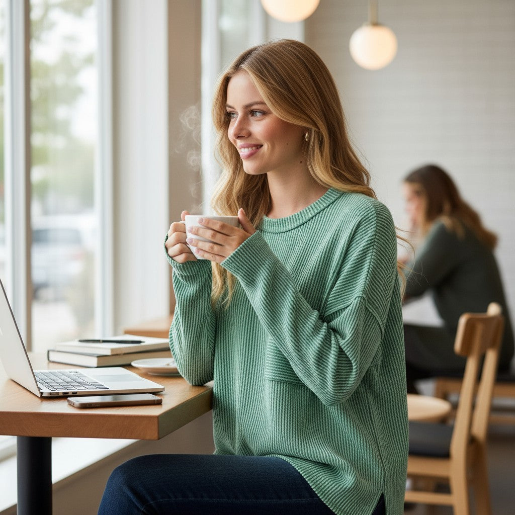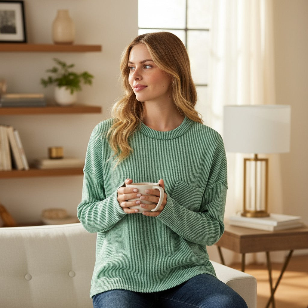 🧶 Corded Rib Knit: Beautiful texture that adds subtle dimension and cozy vibes.