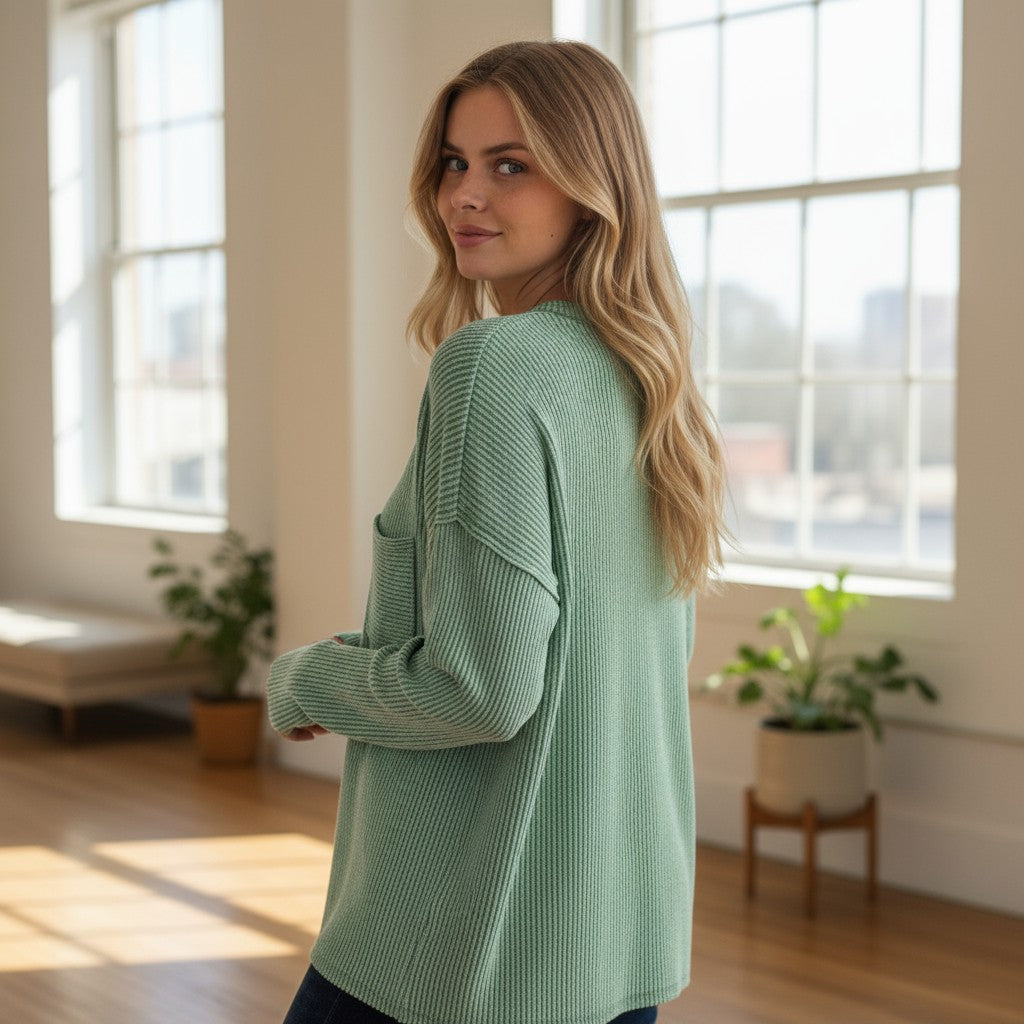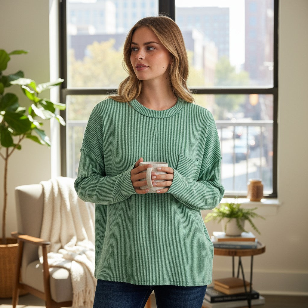 Wrap yourself in everyday ease with the Comfort Theory Top, your new go-to for cozy days and casual outings. Made from a wavy corded rib knit that’s buttery soft and breathable, this drop shoulder long sleeve top gives you that effortless relaxed look without sacrificing style.