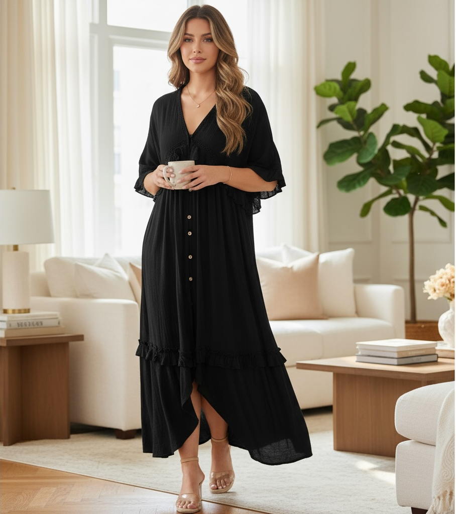 Step into your own fairytale with the Ever After Dress — a gauzy, romantic cottagecore maxi that’s pure magic! With its dreamy layers of ruffles, delicate lace insets, and soft tie-back detail, this button-down beauty is made to twirl through gardens, brunches, or any moment that calls for a touch of whimsy.