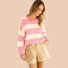 Get wrapped in sweetness with this ultra-soft fuzzy knit! The Strawberry Sugar Sweater features warm blush-and-cream stripes and a cozy relaxed fit that feels like your favorite blanket—but make it stylish. The fuzzy texture and roomy cut make it perfect for fall, winter, lounging, or layering.