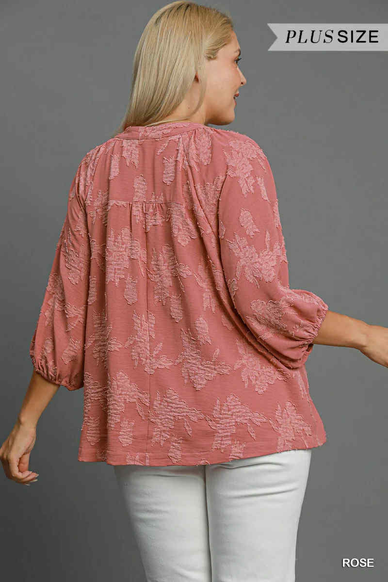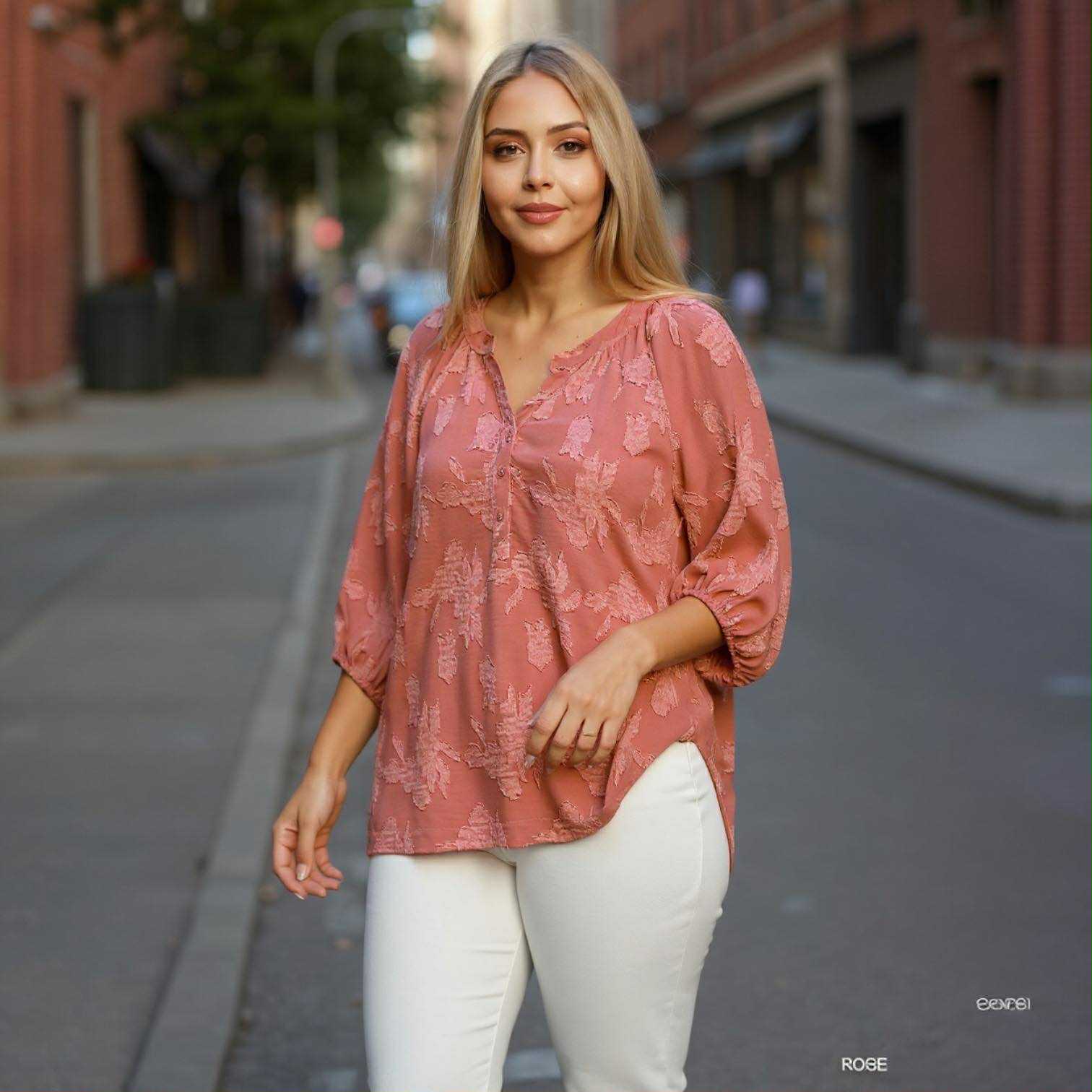 Celebrate your curves with this stunning floral blouse designed for everyday beauty and comfort. With its textured floral pattern and bubble sleeves, this piece is both effortless and elegant — a go-to for workdays, weekends, or special outings.