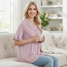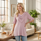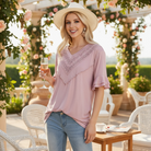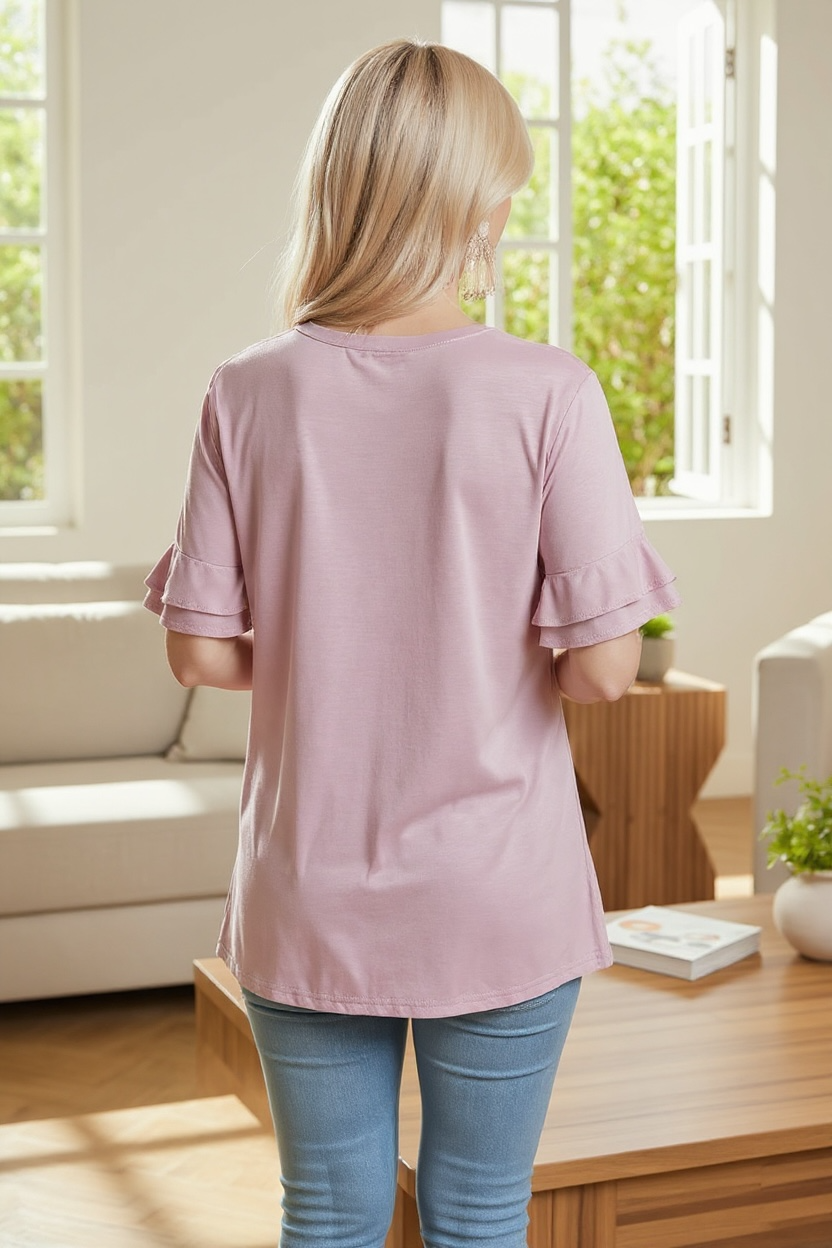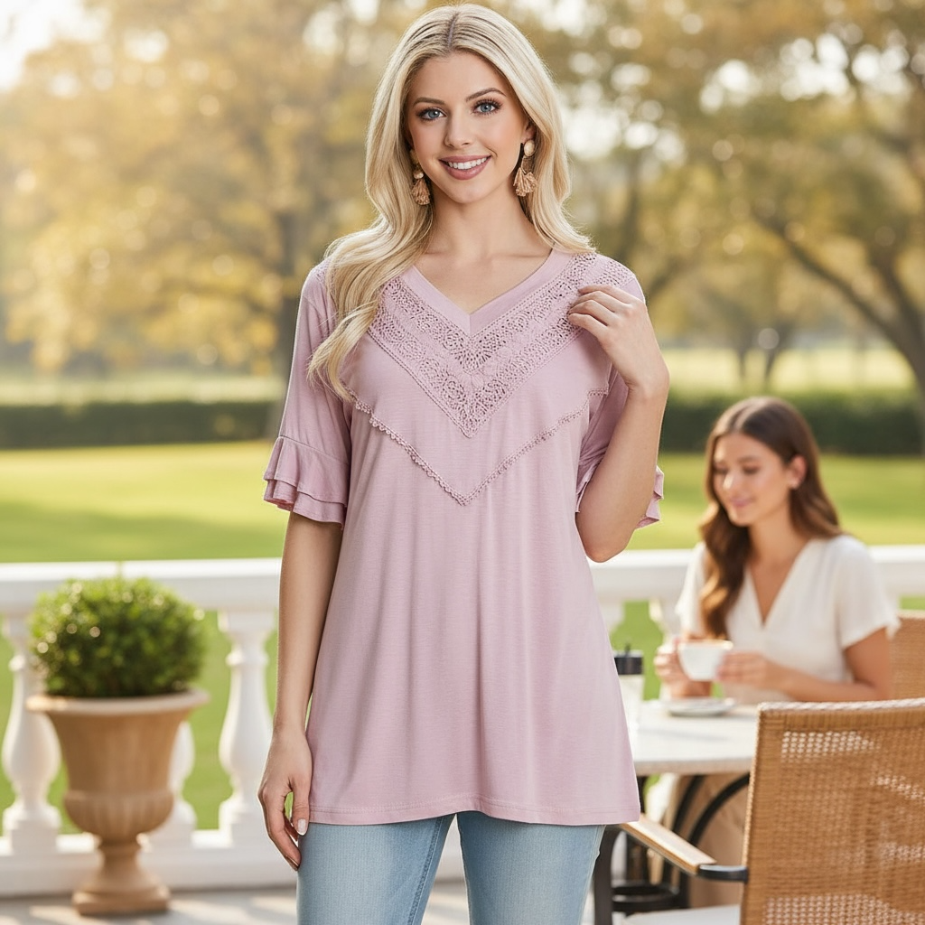 🪡 Features: V-Neck, Lace Trim, Ruffle Sleeves, Relaxed Fit
