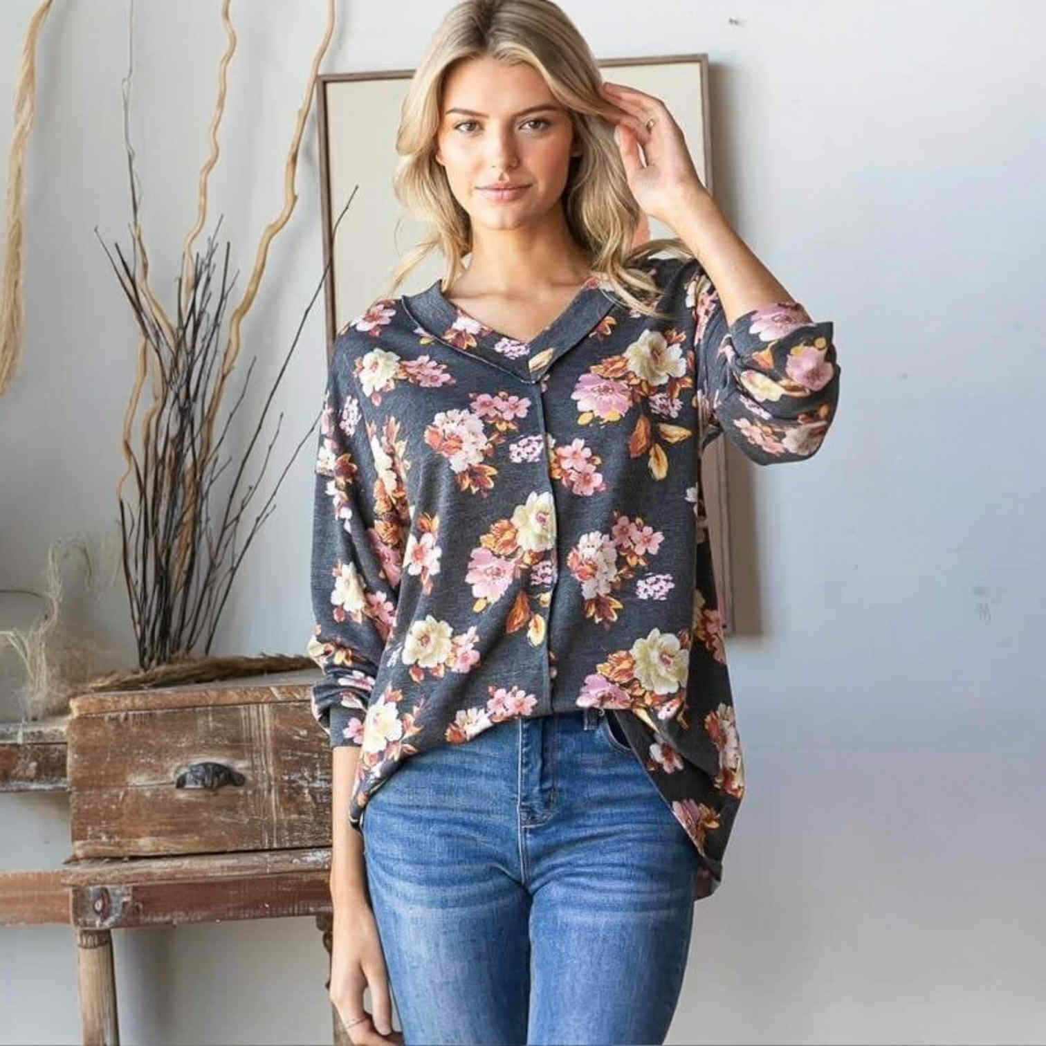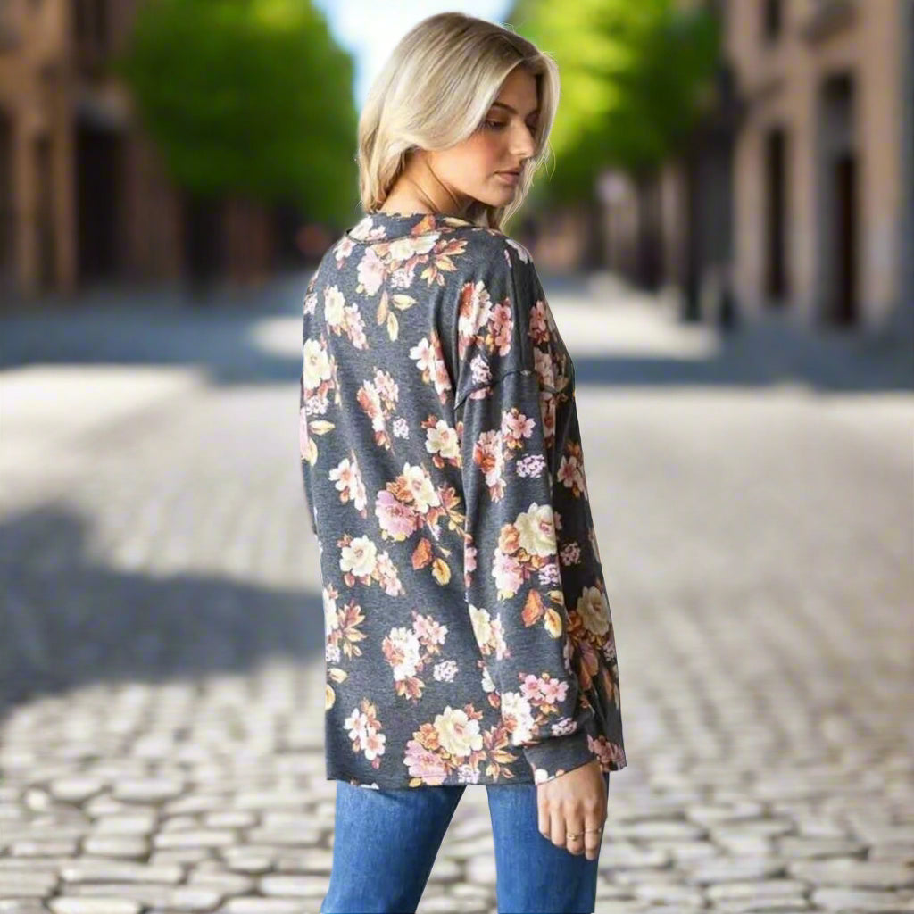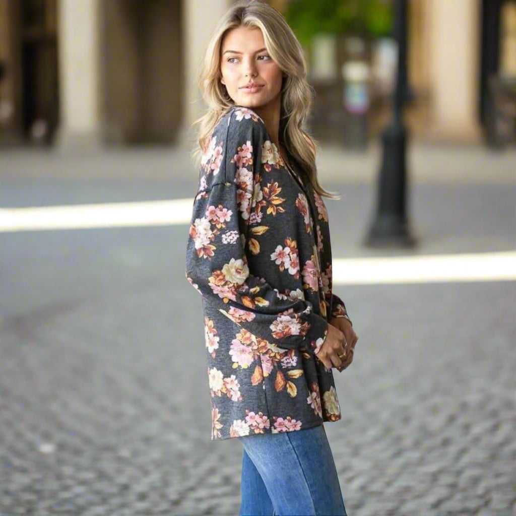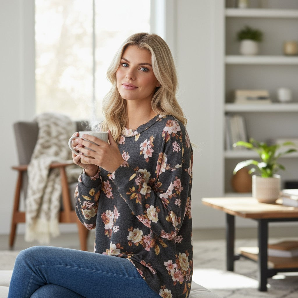 Soft, stretchy, and beautifully feminine—this floral long sleeve top is the perfect blend of comfort and fall style. The charcoal base with muted blossoms gives it an effortless “evening floral” vibe you can dress up or down.