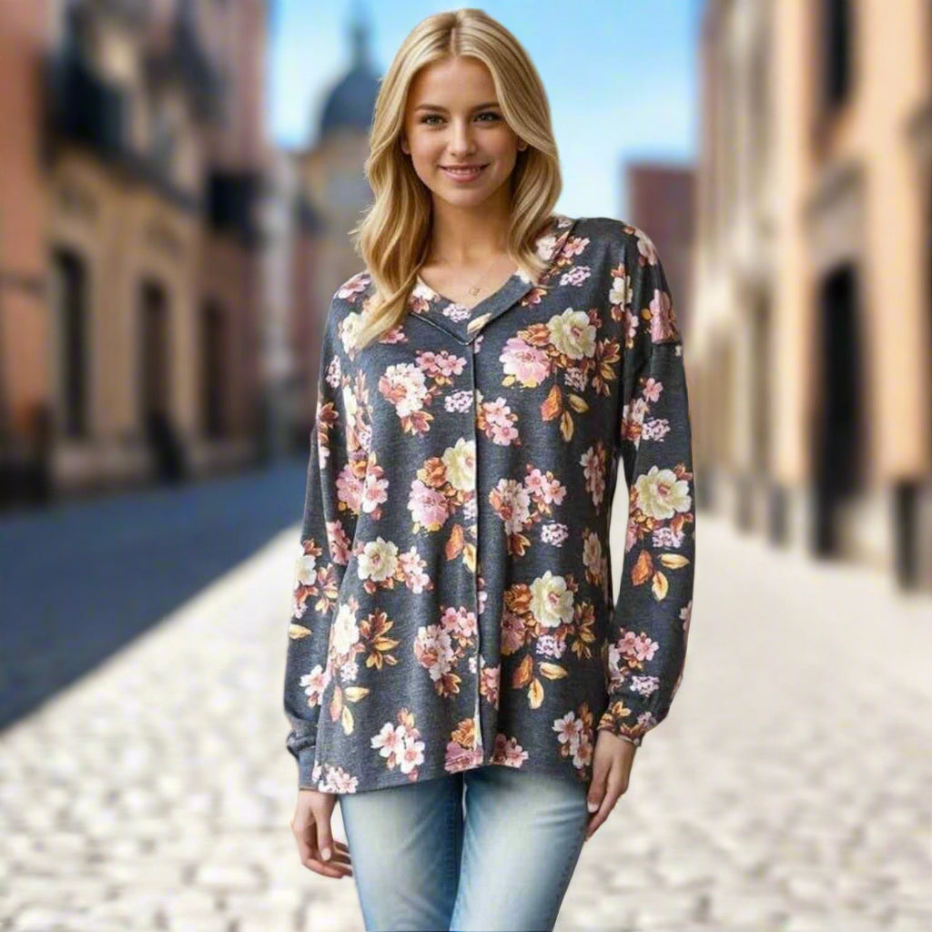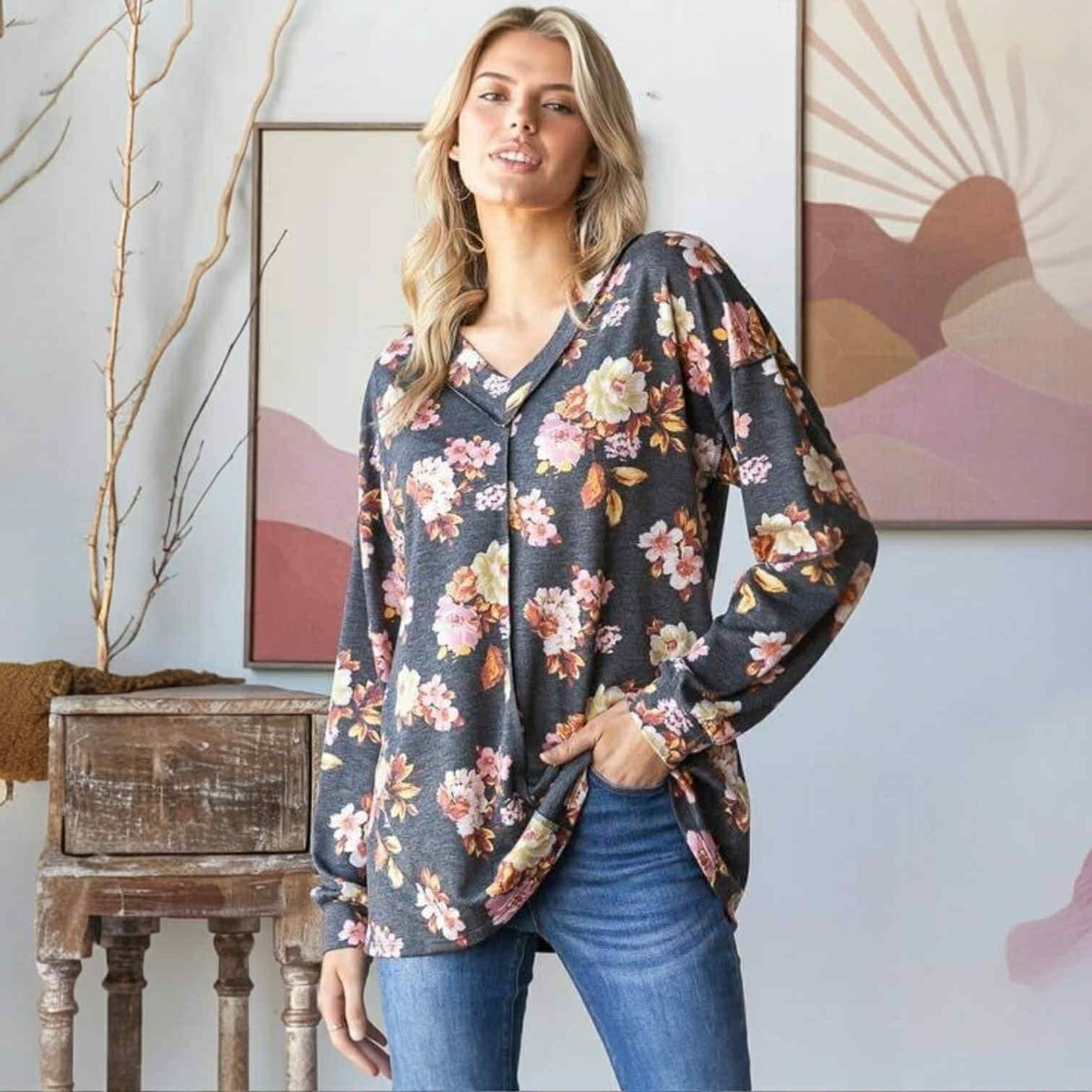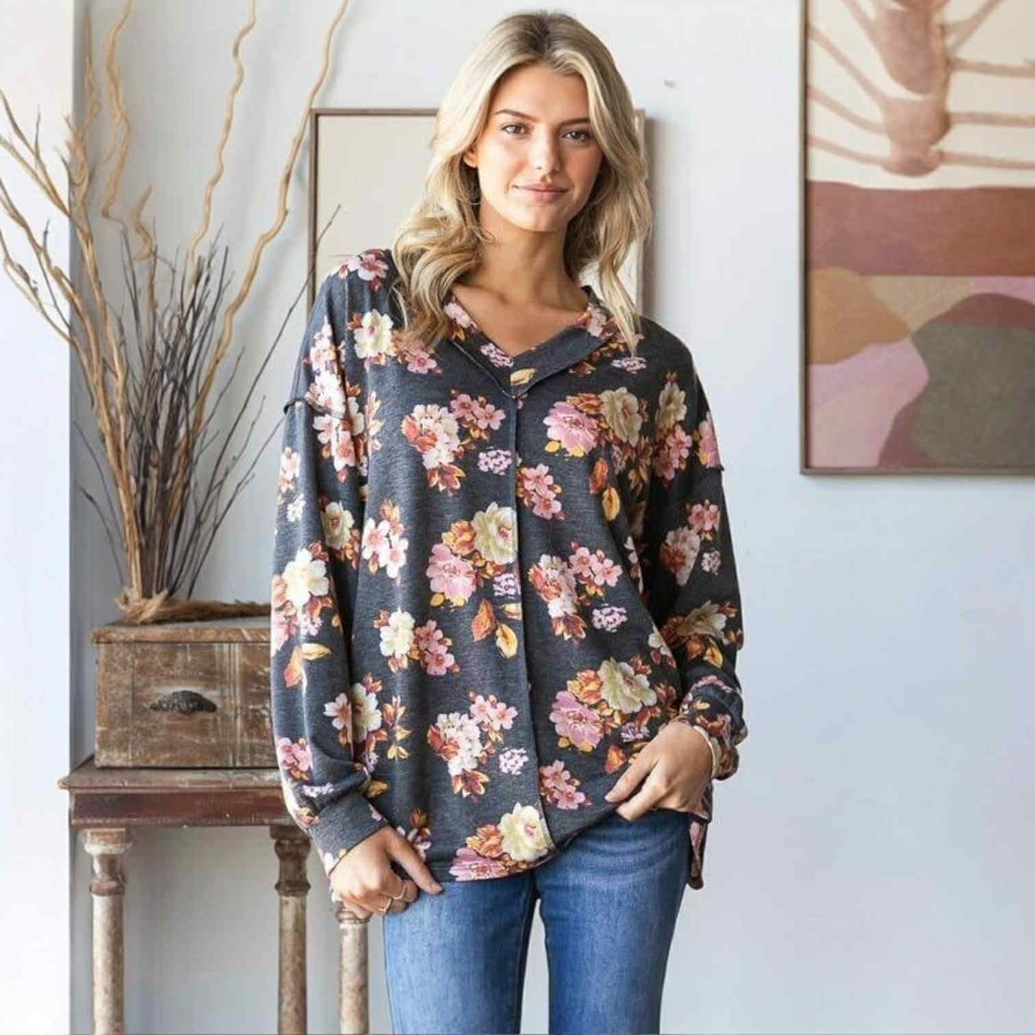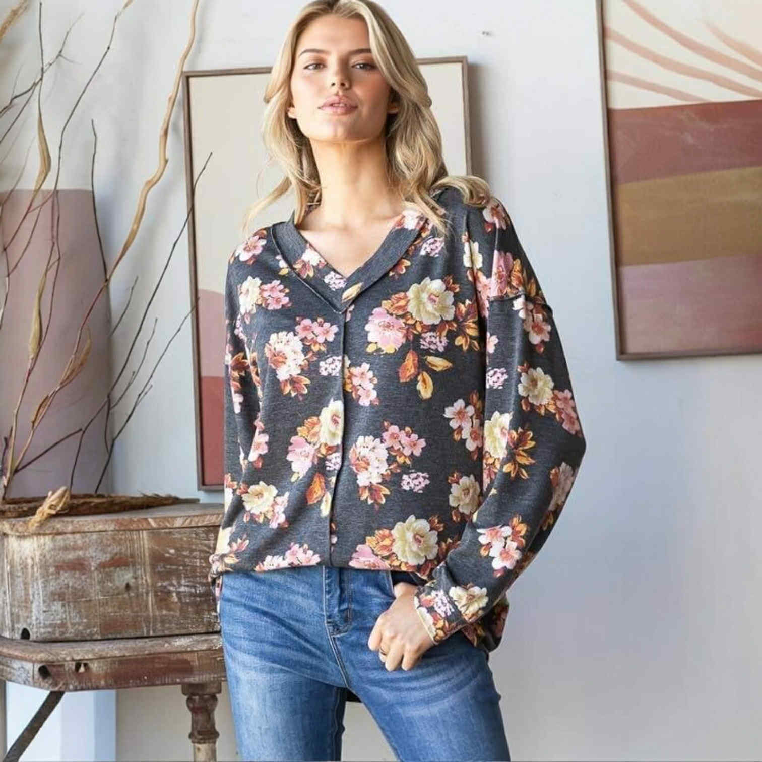Soft, stretchy, and beautifully feminine—this floral long sleeve top is the perfect blend of comfort and fall style. The charcoal base with muted blossoms gives it an effortless “evening floral” vibe you can dress up or down.