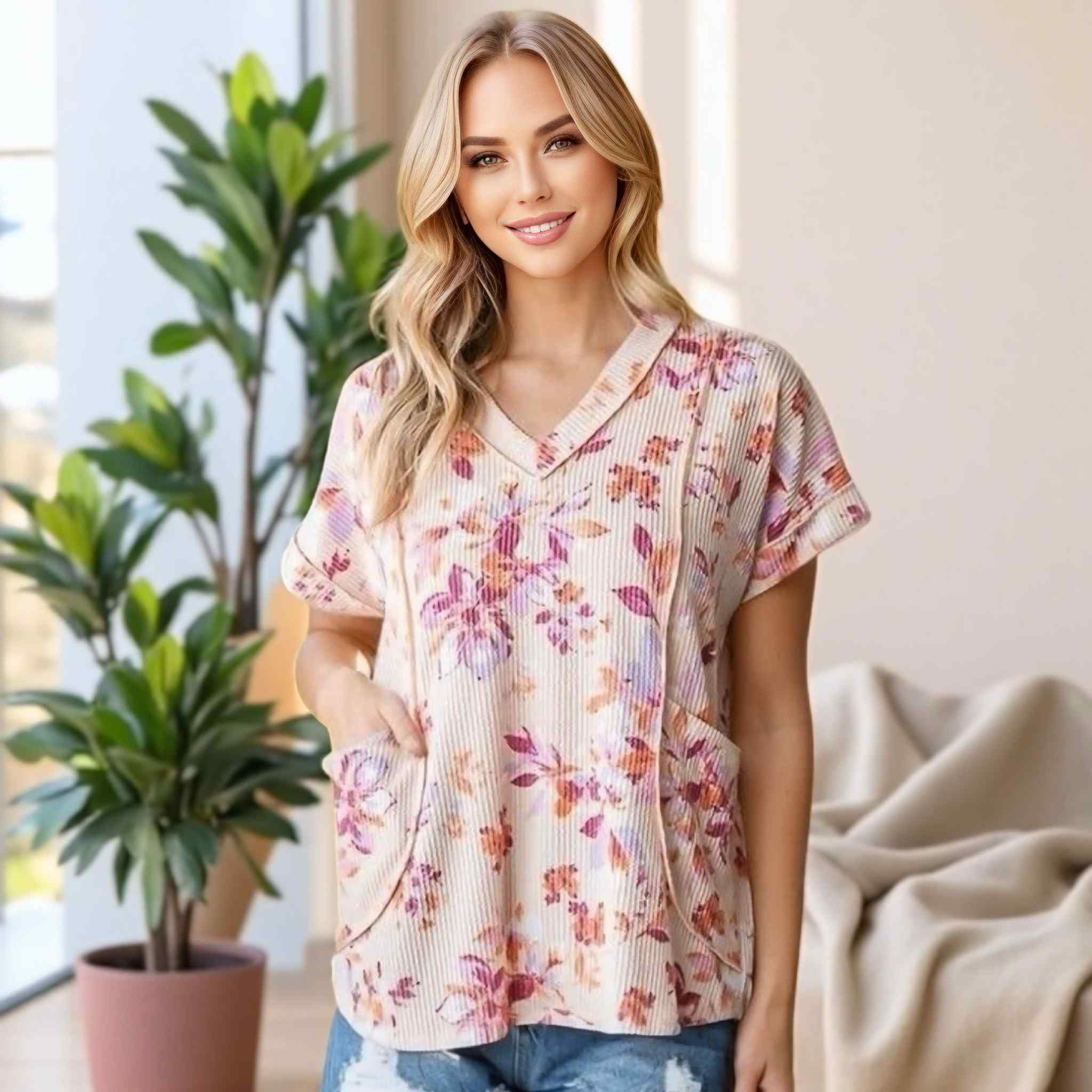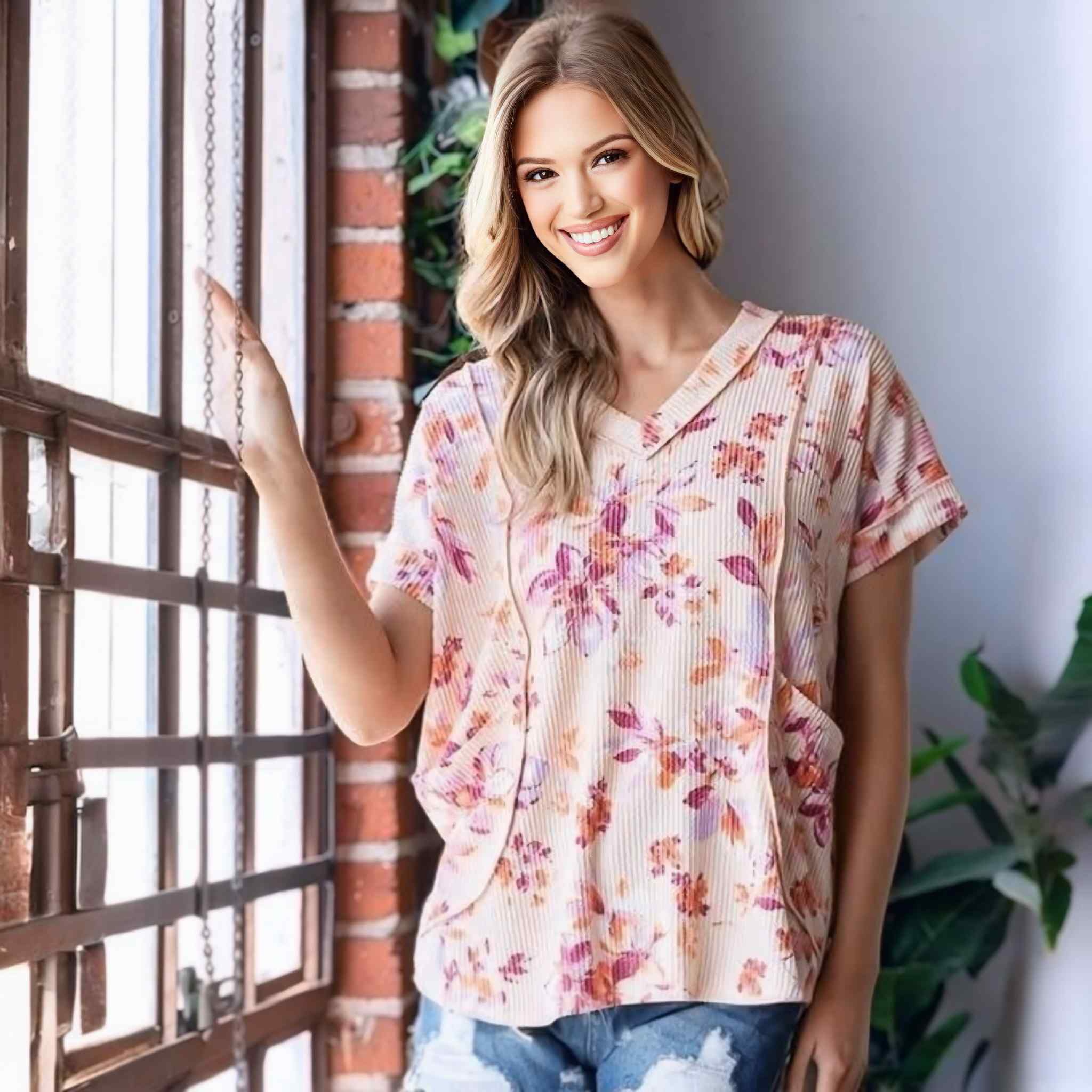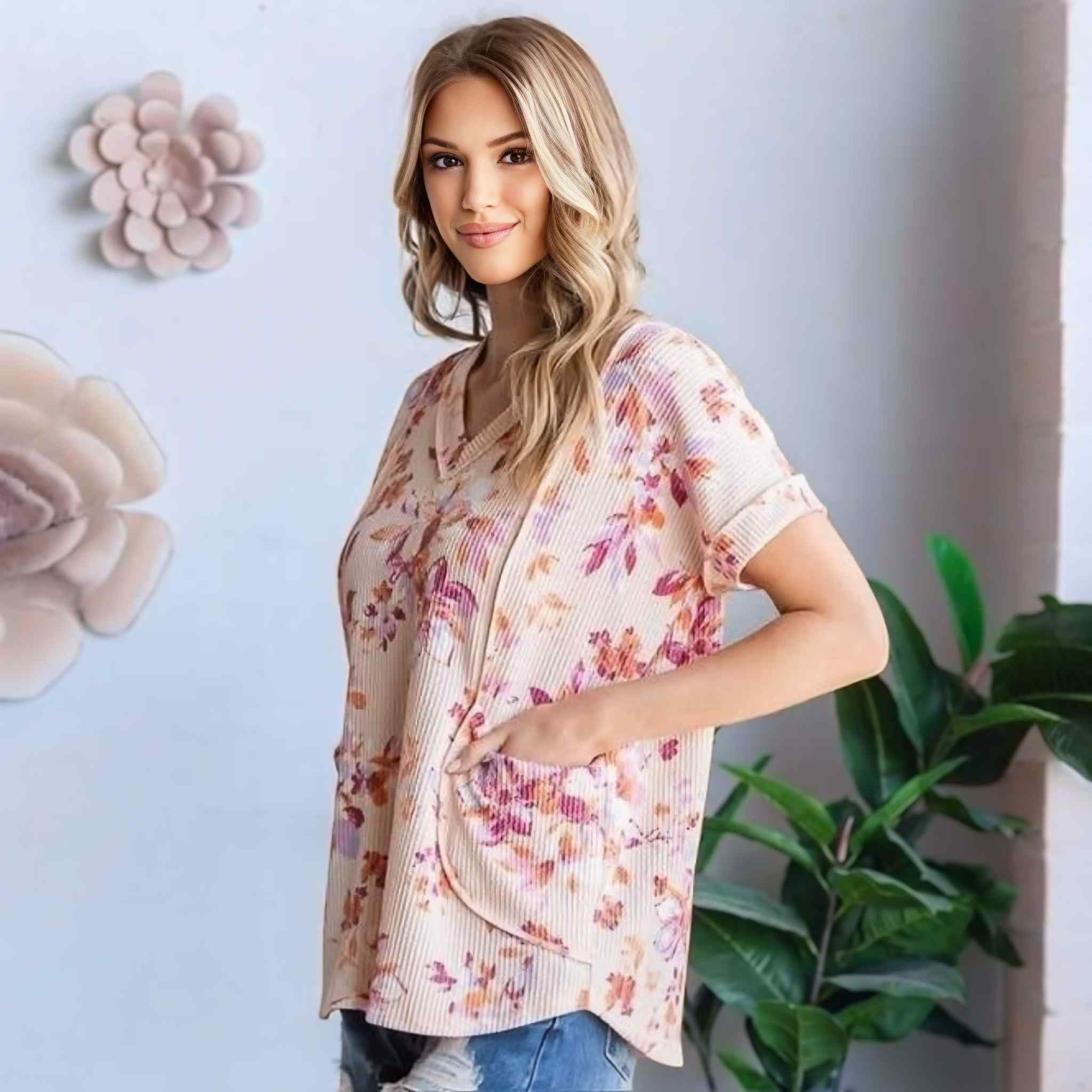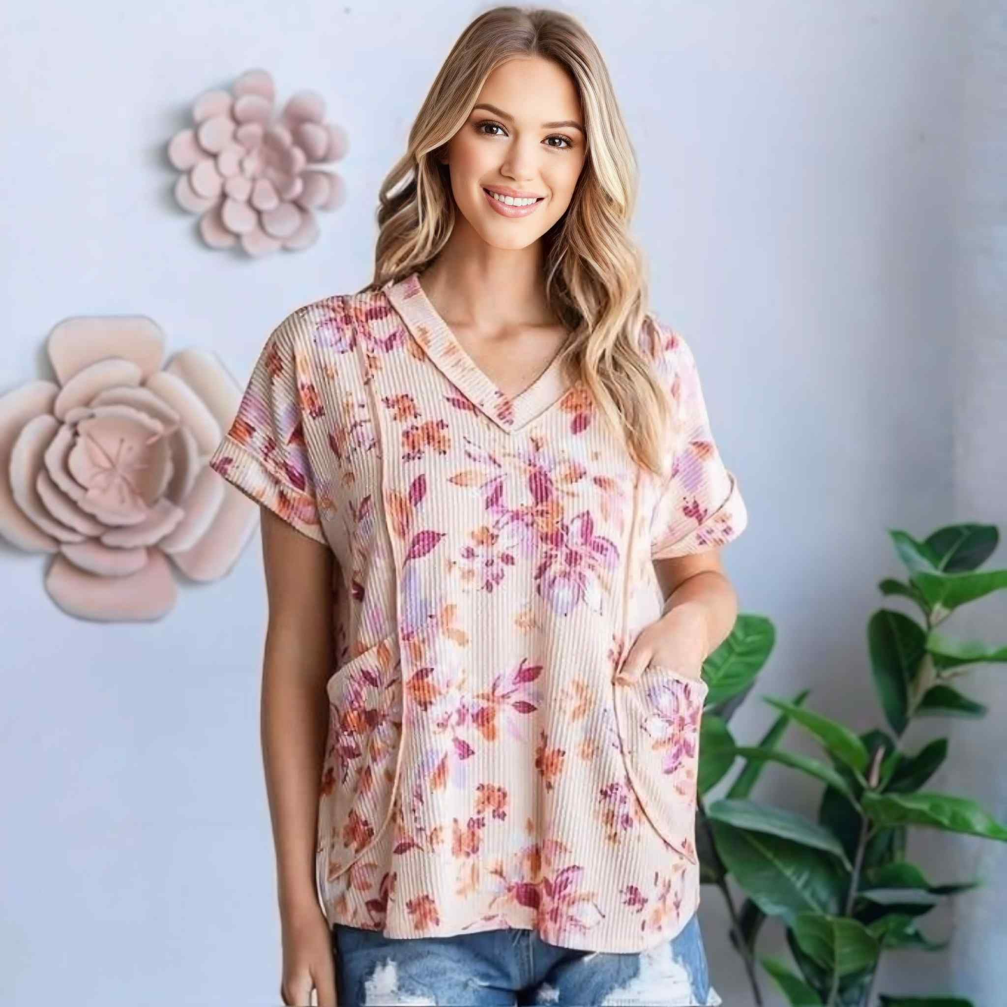 Step into fall with effortless charm in this short sleeve V-neck floral ribbed top! Designed with a soft, urban rib texture and accented by hem and stitch details, this piece blends casual comfort with seasonal beauty. The roomy front pockets add both style and function, making it your go-to for everyday outings.