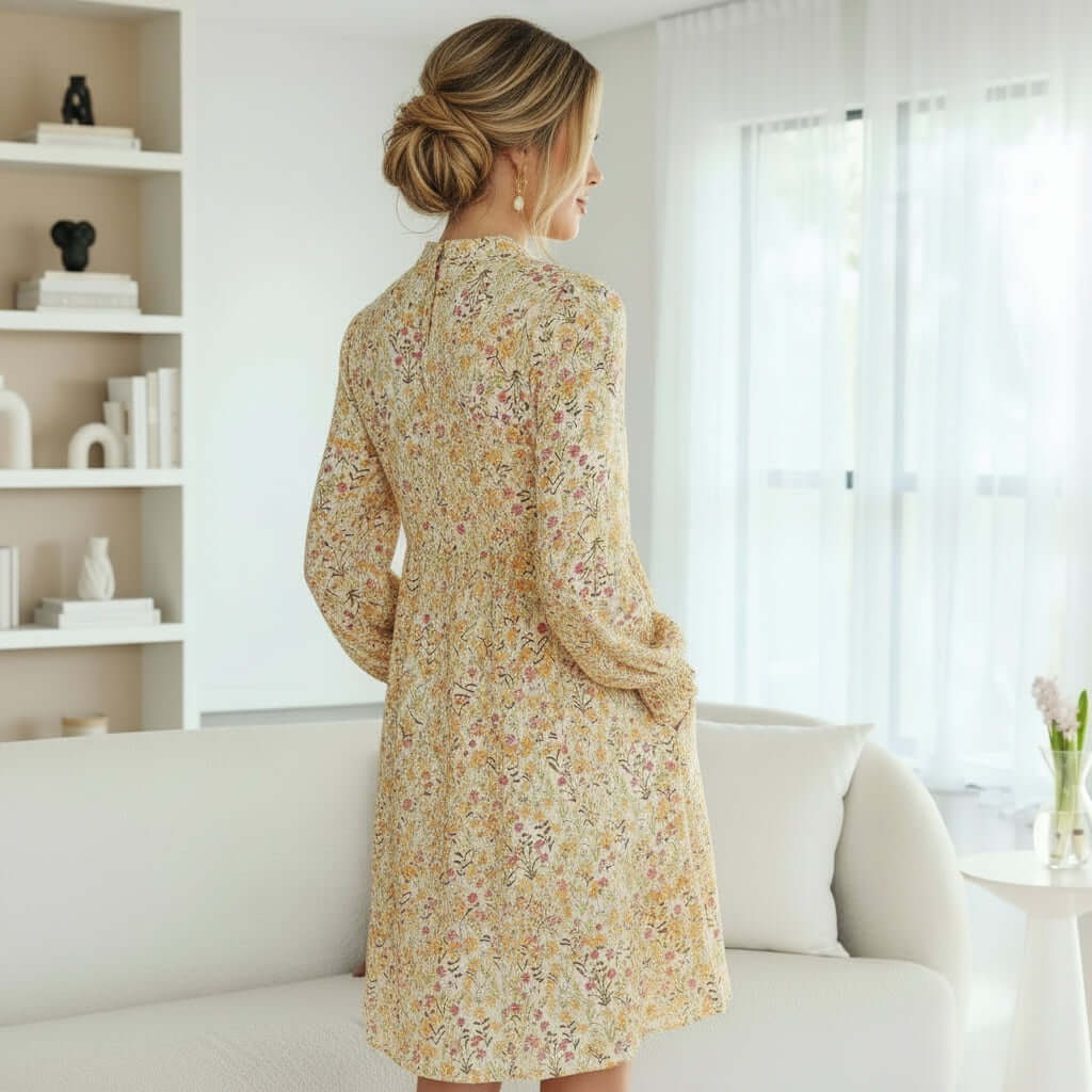 Yellow Floral Print Frilly Trim Smocked Cuff Long Sleeve Shirt Dress