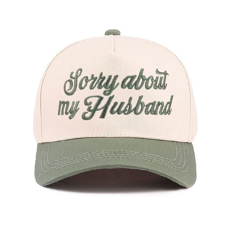 Cream-colored base with embroidered “Sorry About My Husband” script