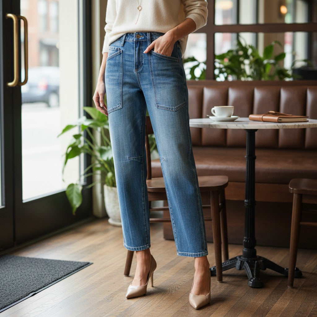 Mid-Rise Wide Barrel Leg w/ Patch Pockets — 4-Way Stretch