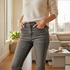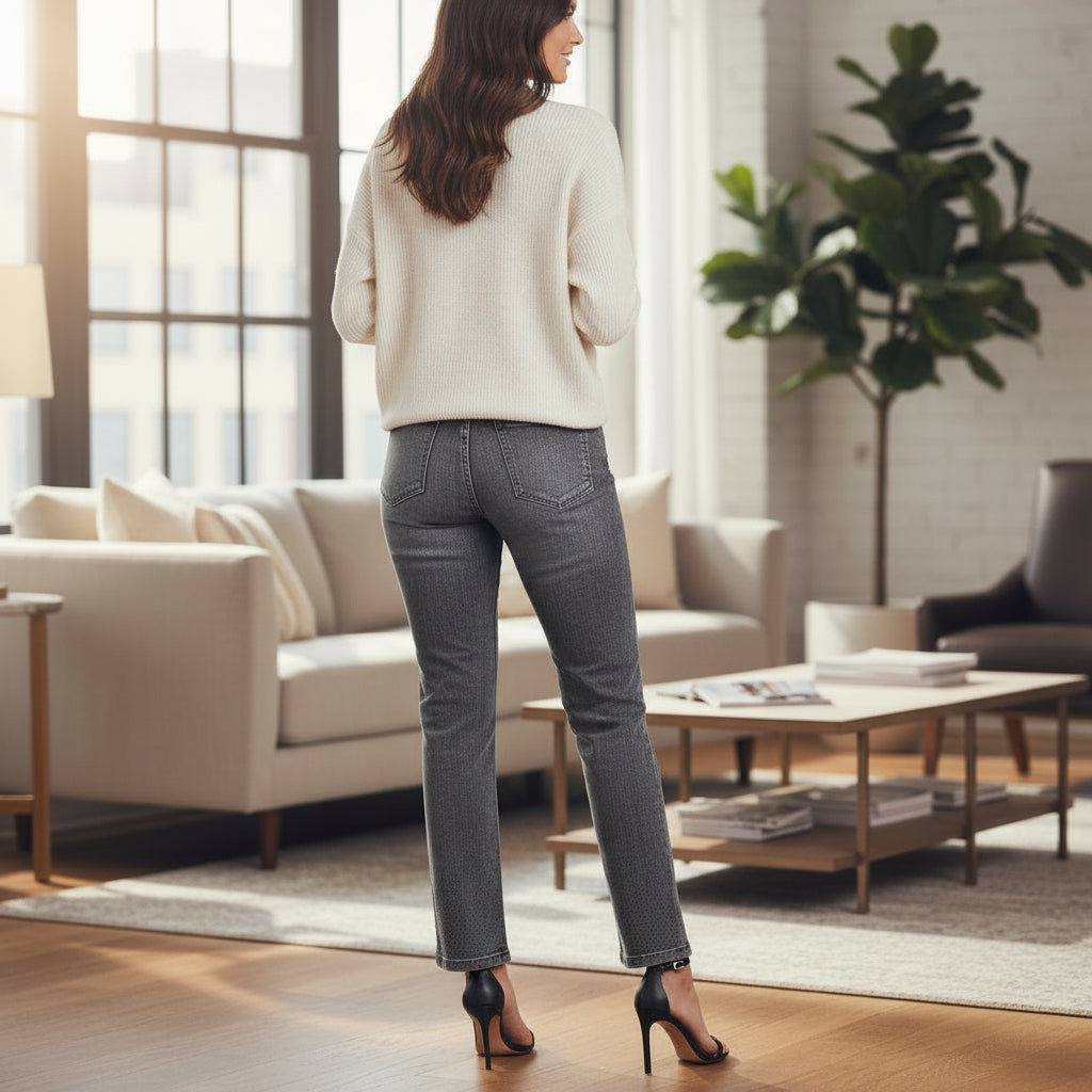 💎 Designed in a chic solid gray wash, these ankle-length jeans keep things modern while the beaded accents catch the light beautifully. Made from a soft, stretchy denim blend, they’re comfortable enough for all-day wear and stylish enough for special occasions.