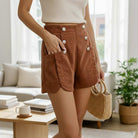 Step into the season in style with our Chestnut Trails Shorts — the perfect blend of cozy texture and timeless charm. Crafted from soft corduroy fabric, these high-waisted beauties bring both comfort and structure to your fall wardrobe.