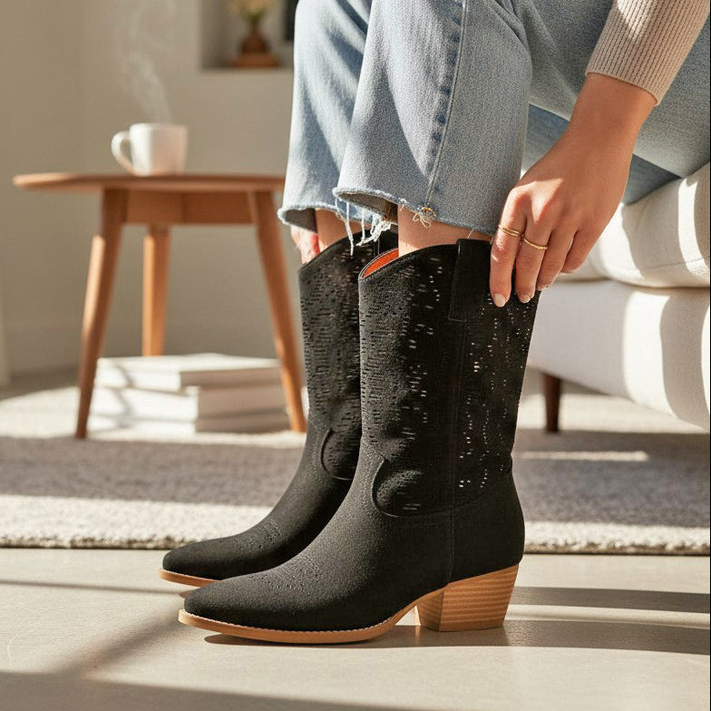 Classic Western charm meets modern detail — the DALLAS boot features a beautifully laser-cut shaft and chic mid-calf height, making it the perfect statement boot for fall, winter, rodeo nights, or everyday style.