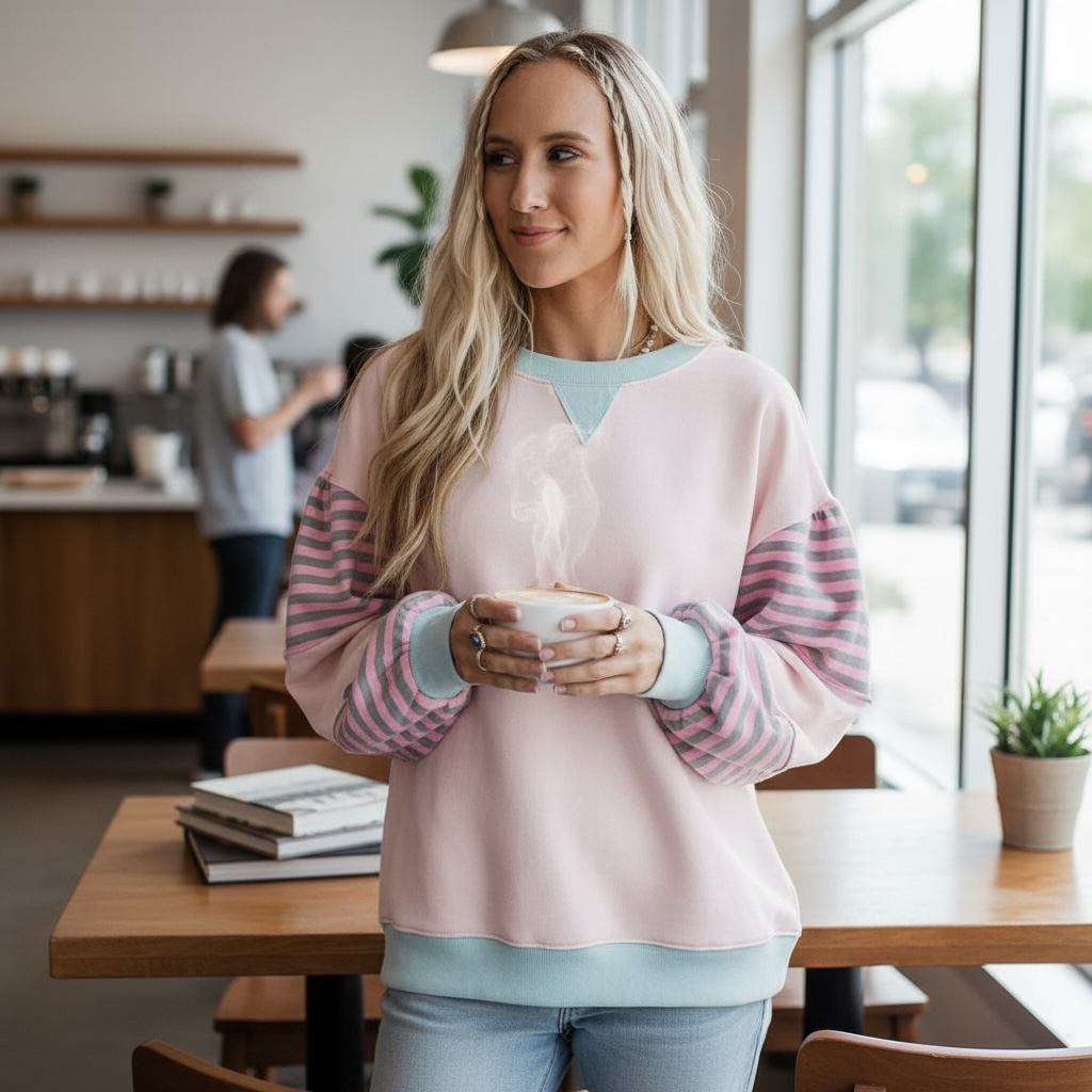 Keep it casual yet chic with the Easygoing Era Crewneck, your new favorite go-to for laid-back days and everyday wear. Designed with a unique colorblock design and striped patchwork sleeves, this sweatshirt brings just the right balance of fun and trendy.