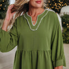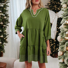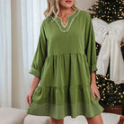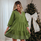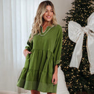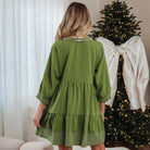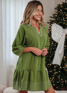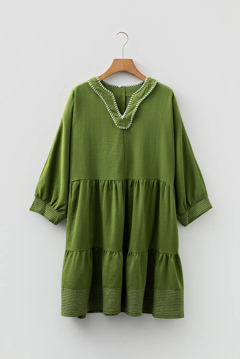 Fall in love with the chic babydoll silhouette of this stunning mini dress! The contrast-stitched V-neckline adds a refined touch, while the tiered design and relaxed 3/4 sleeves create a flowy, flattering fit. Finished with a striped hemline detail, this beauty blends modern charm with timeless style for a look that’s effortlessly enchanting.