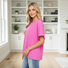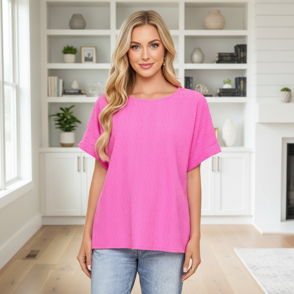 Add a vibrant pop of color to your everyday wardrobe with the Fresh Focus Textured Top by André’. Designed in a rich magenta hue, this modern blouse blends relaxed comfort with refined detail. The unique textured fabric adds subtle dimension, while the flowy silhouette and flattering dolman sleeves create an effortless drape that moves beautifully with you.