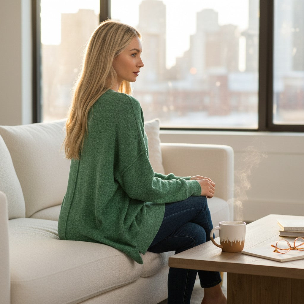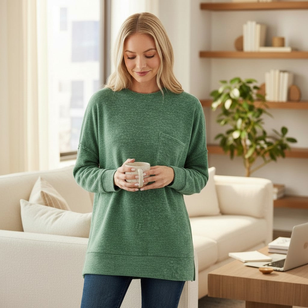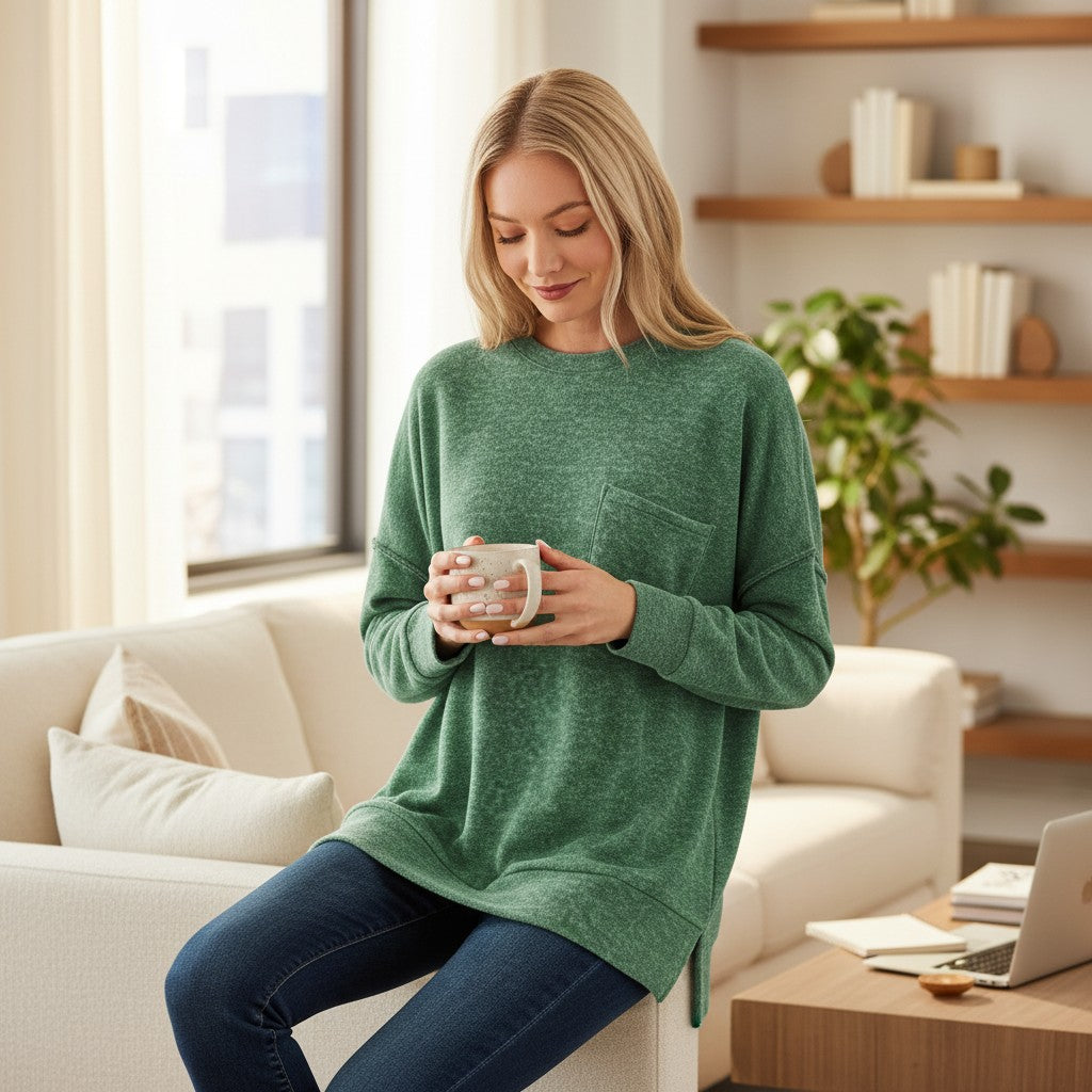 The Relax & Restore Sweater is your new ultimate cozy essential — soft, oversized, and effortlessly flattering. This brushed melange knit feels luxuriously smooth, while the drop-shoulder fit and hi-low hem create that relaxed, easygoing silhouette that customers LOVE.
