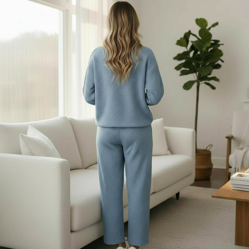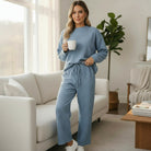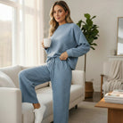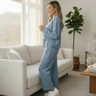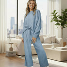 The long-sleeve top drapes beautifully with a relaxed fit, while the wide-leg pants feature an adjustable drawstring waist for all-day ease. The solid color and subtle texture give this set a clean, modern look that won’t feel dated—perfect for lounging, errands, or casual days out.
