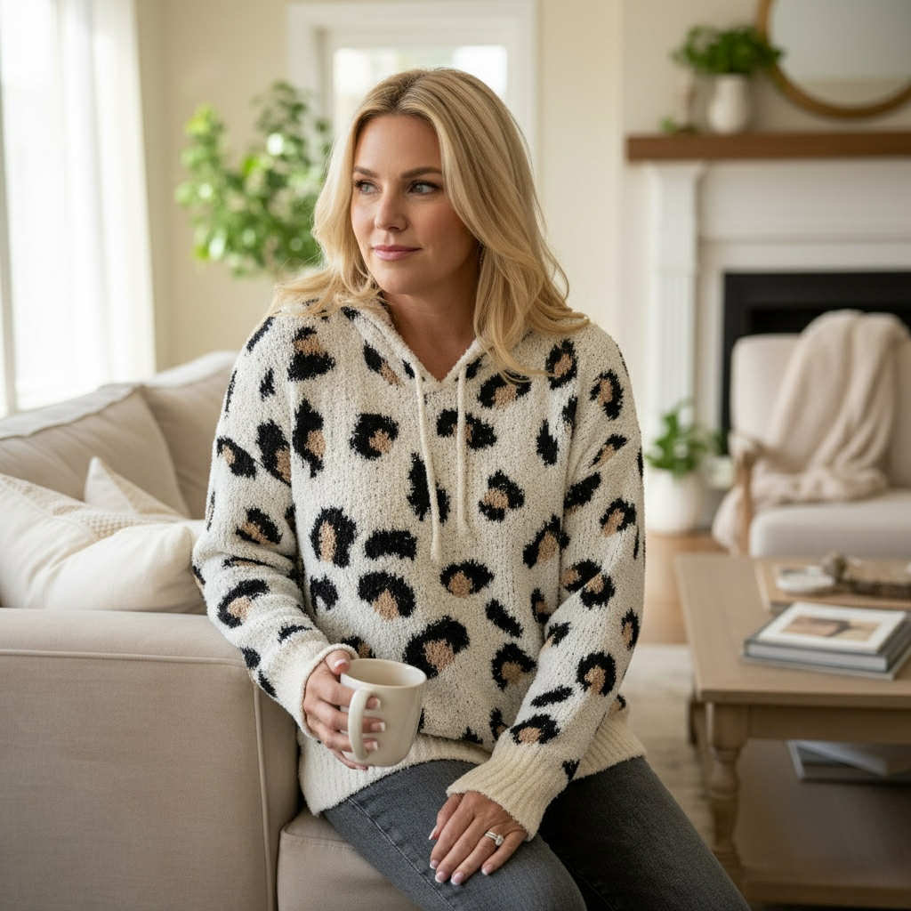 Stay cozy and effortlessly chic in the Snuggle Instincts Hooded Sweater — a soft, chenille dream that wraps you in warmth and wild style. With its relaxed oversized fit and playful leopard print, this piece is perfect for lounging, layering, or casual days out.