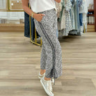 Step out in style with these Spotted Spirit Pants, the perfect blend of comfort and bold fashion. The soft gray leopard print gives them a fun, trendy twist while keeping them versatile enough to pair with your favorite basics. Designed with a high waistline for a flattering fit and side piping with bow detail for an extra touch of charm, these straight-leg pants are made for effortless everyday wear.