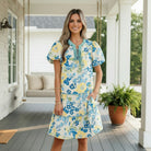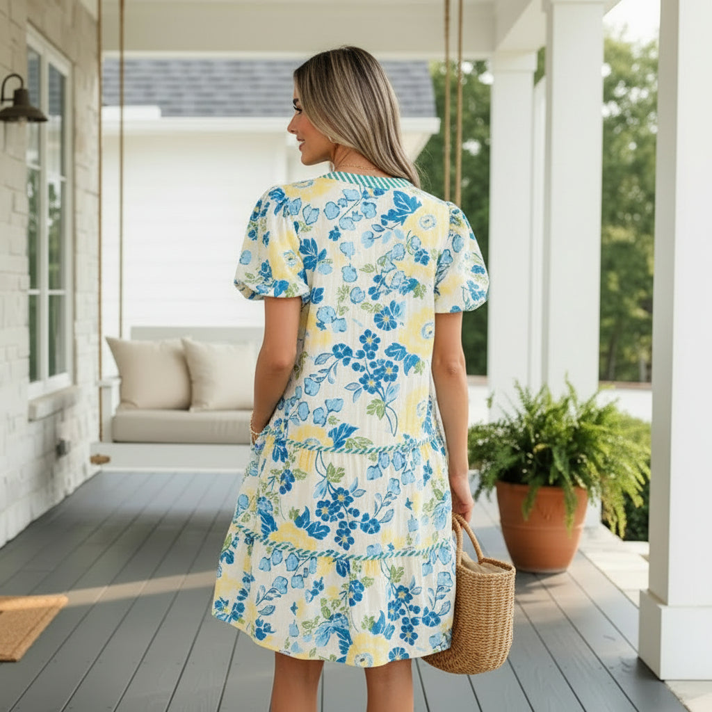 Puff short sleeves create gentle volume at the shoulders, while the tiered skirt design gives movement and flow. The above-the-knee length keeps it light and versatile, making it perfect for brunch, church, baby showers, or everyday polished wear.