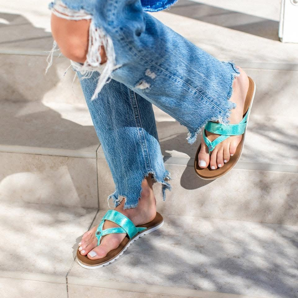 Discover the vibrant and stylish YELLOW BOX - SHAYNE sandals in Turquoise shimmer and silver. Perfect for any Sporty occasion, these flip flops will add a pop of color and energy to every step! Get ready for summer in style with SHAYNE! This multi-strap flip-flop is crafted from shimmer-textured faux leather and features a center logo stud. From our SPORTYB™ collection, it has a Signature Yellow Box EVA footbed and a razor lug sole for both style and comfort.