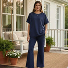 Introducing the perfect travel set designed for comfort and style on all your adventures. The waterfall poncho-style relaxed top paired with slight bell flare pants creates such a flattering silhouette without ever feeling tight or restrictive.