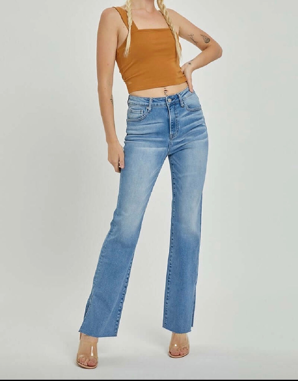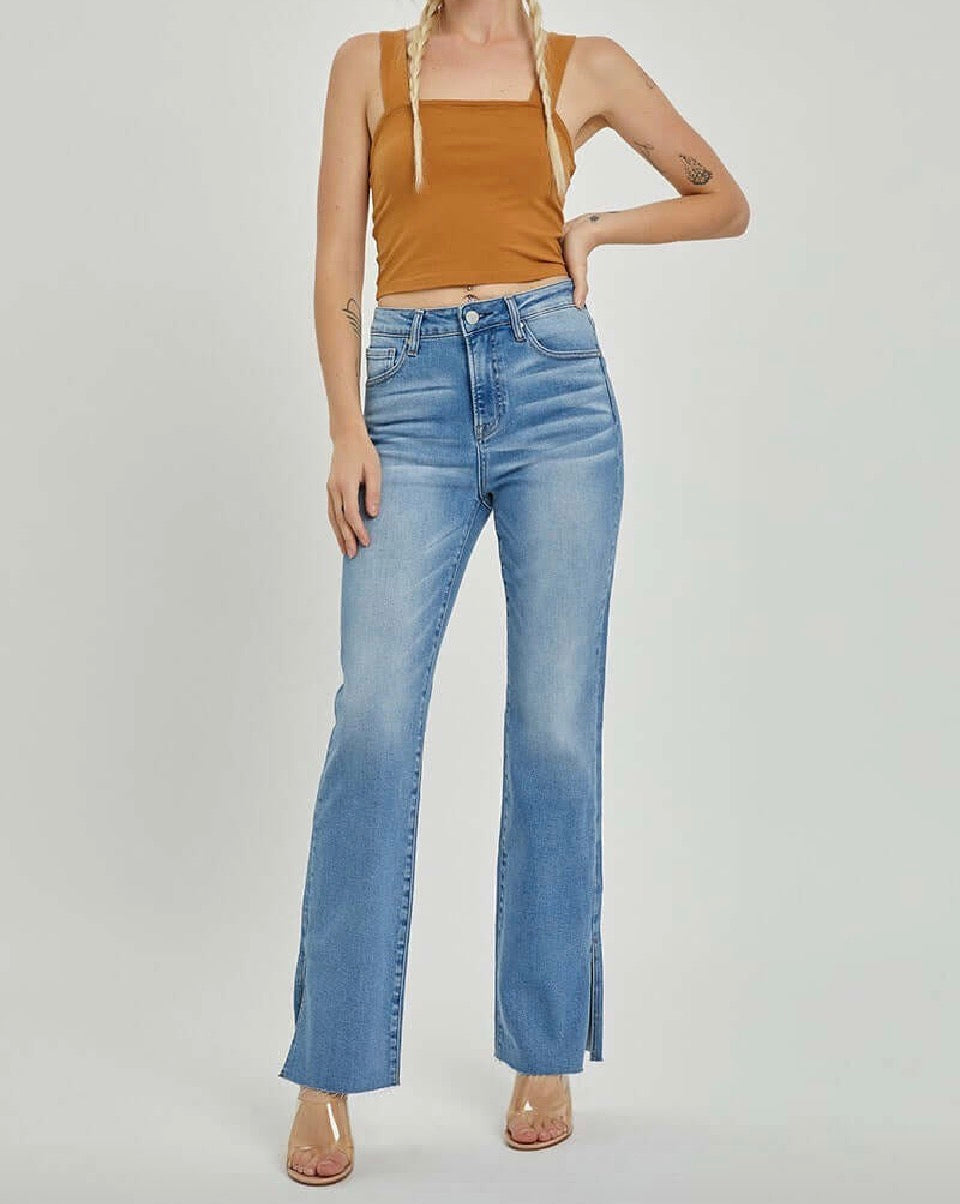 SHILO Bootcut Jeans by Risen in medium wash, featuring high rise, side split hem, and flattering fit.
