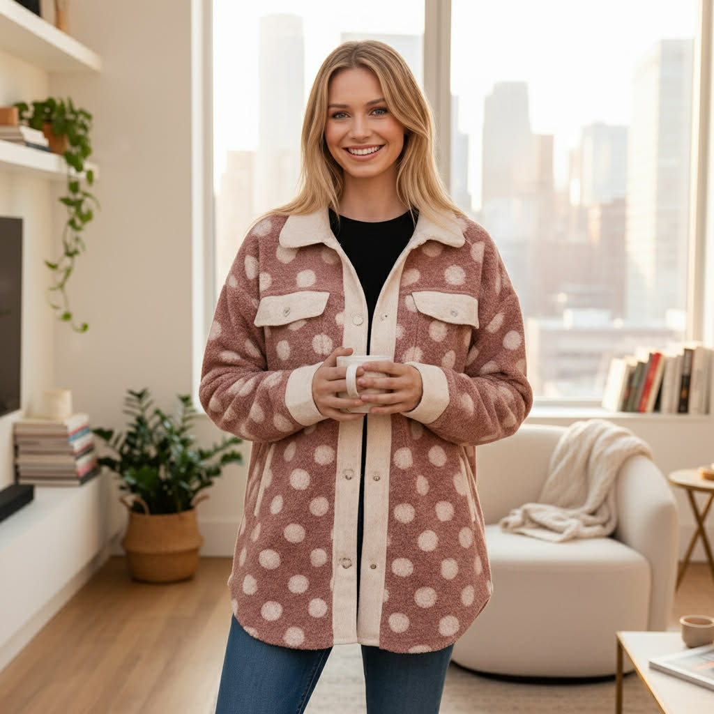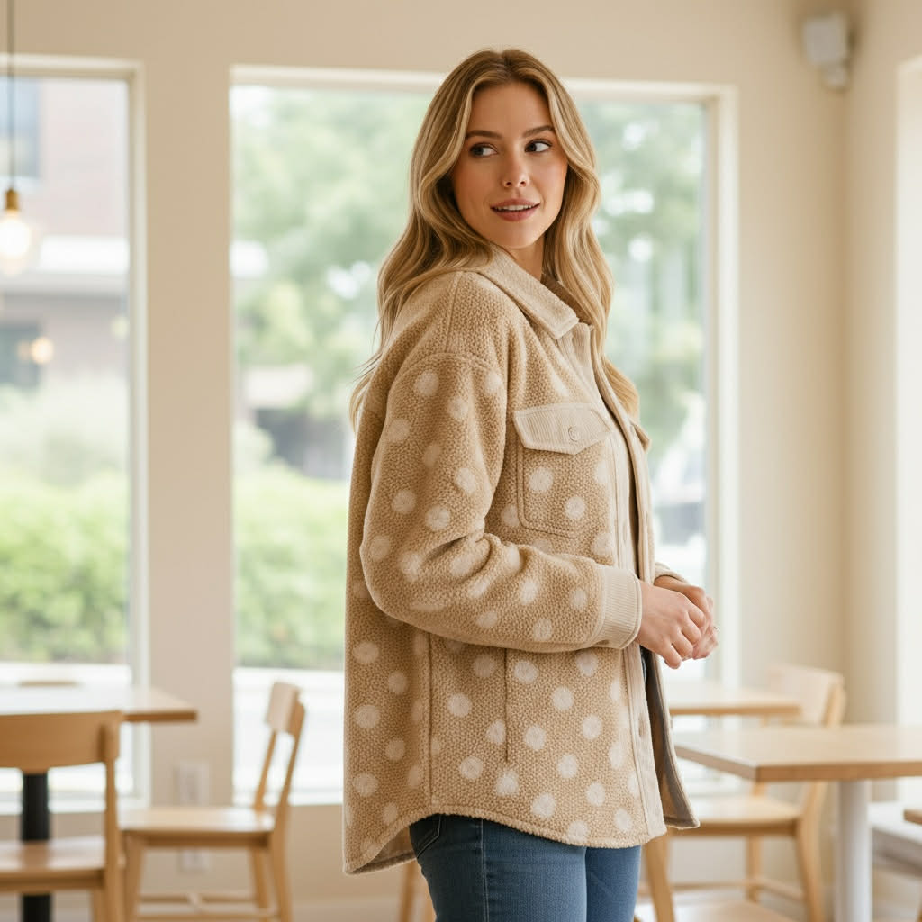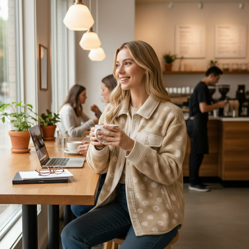 Woman wearing WARM IMPRESSIONS BUTTON DOWN shacket, holding a coffee cup in a café setting.