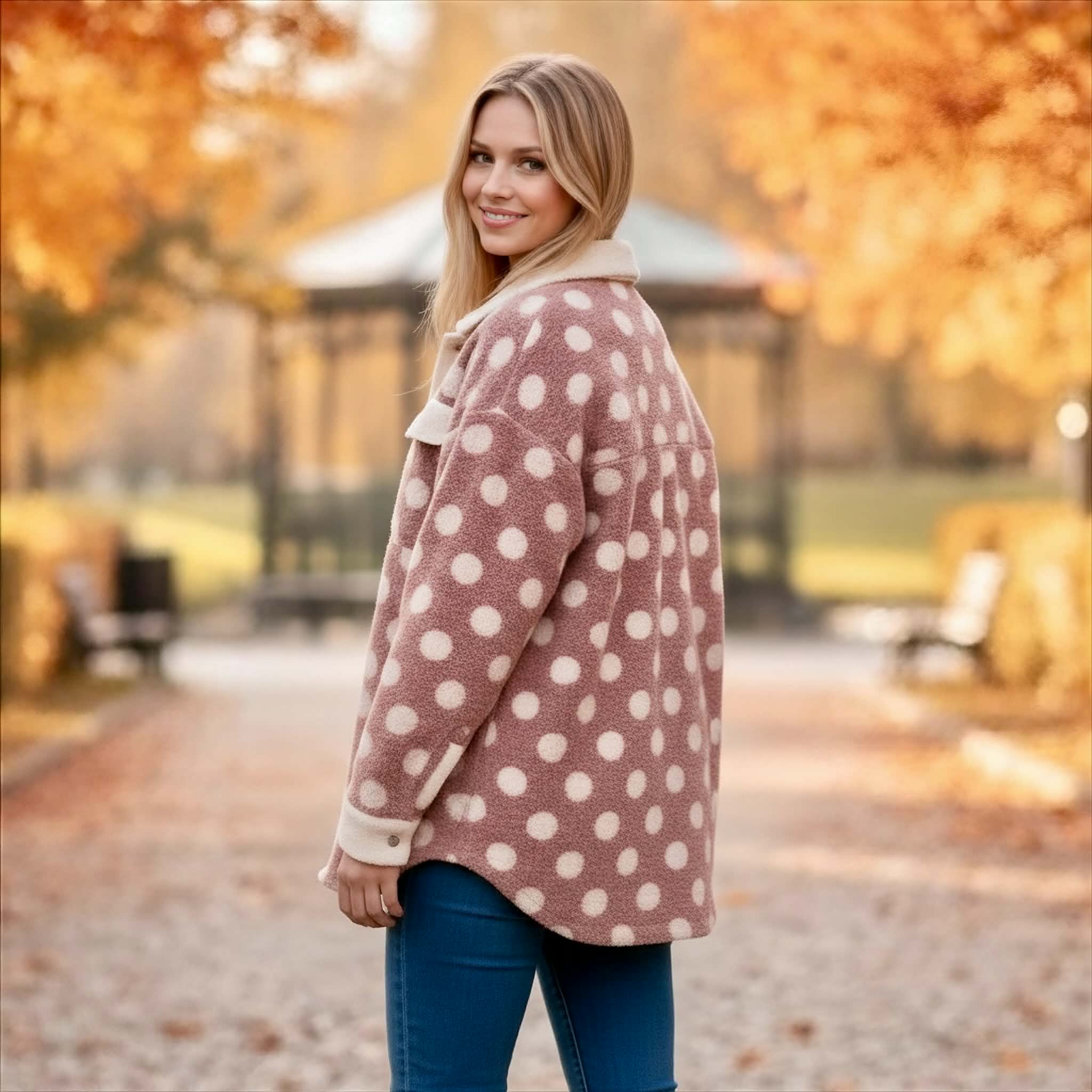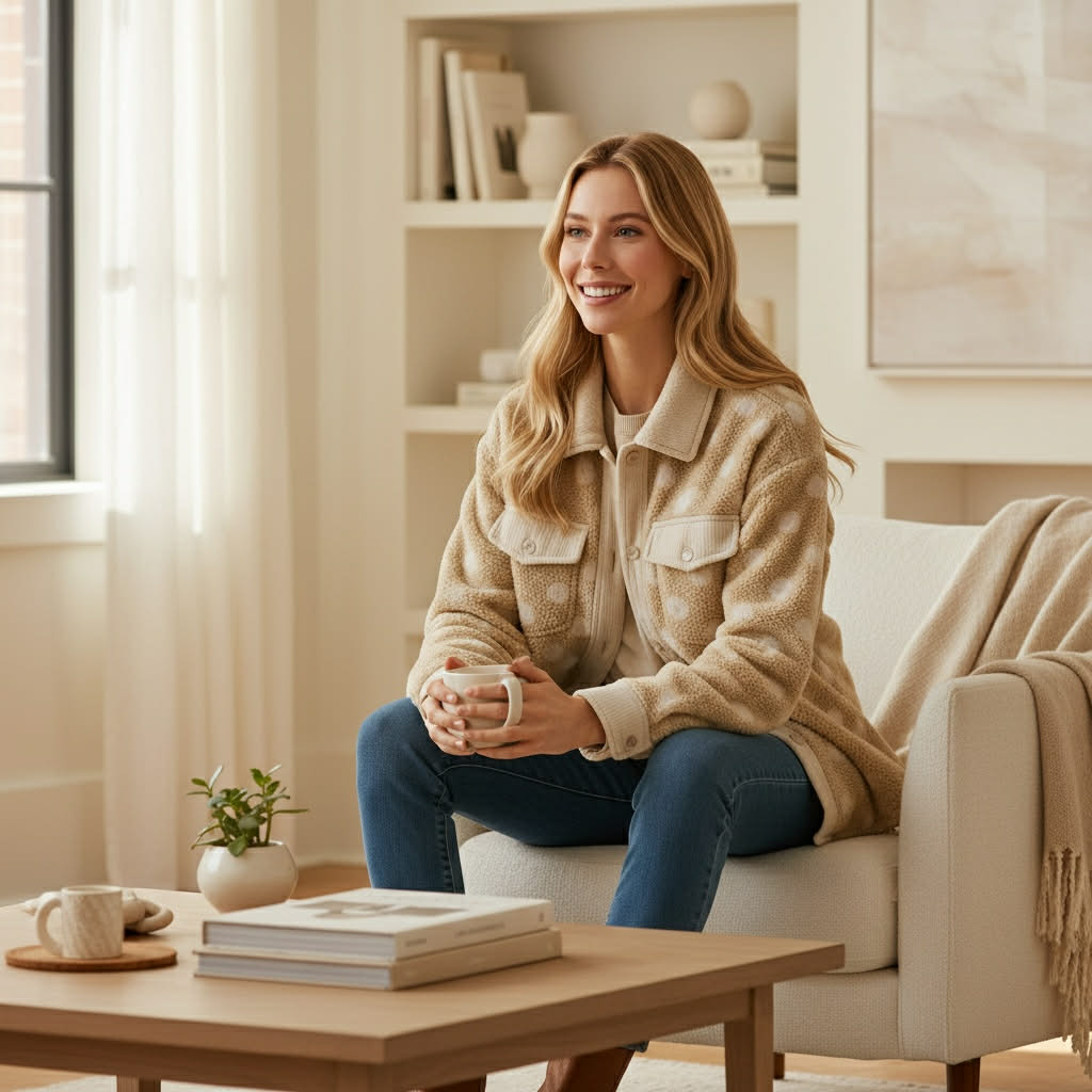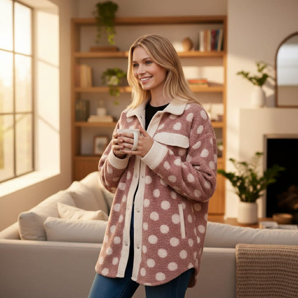 Woman wearing WARM IMPRESSIONS BUTTON DOWN shacket, holding a coffee cup in a café setting.
