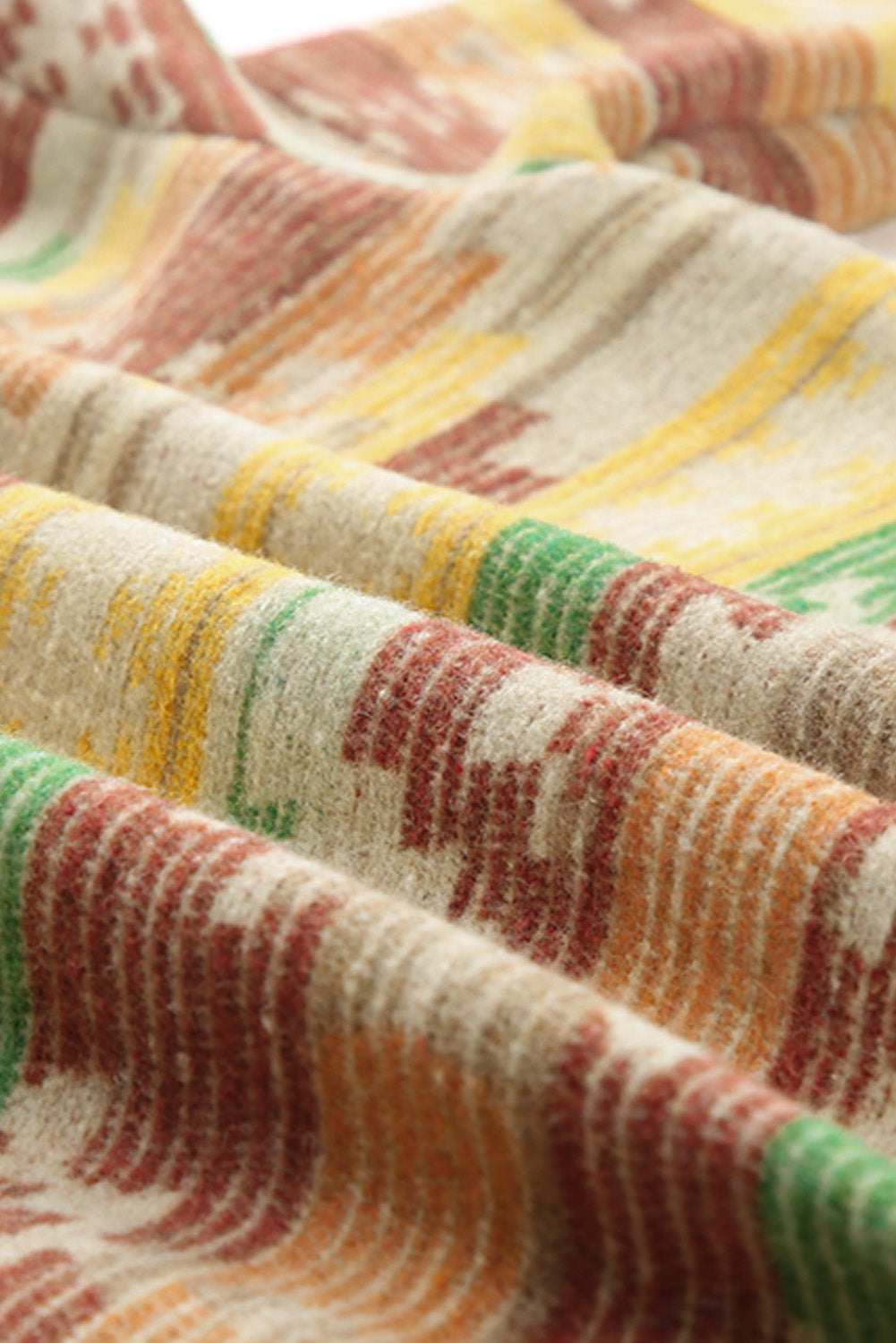 Woman wearing WARM IMPRESSIONS BUTTON DOWN shacket, sipping coffee outdoors at a cafe.