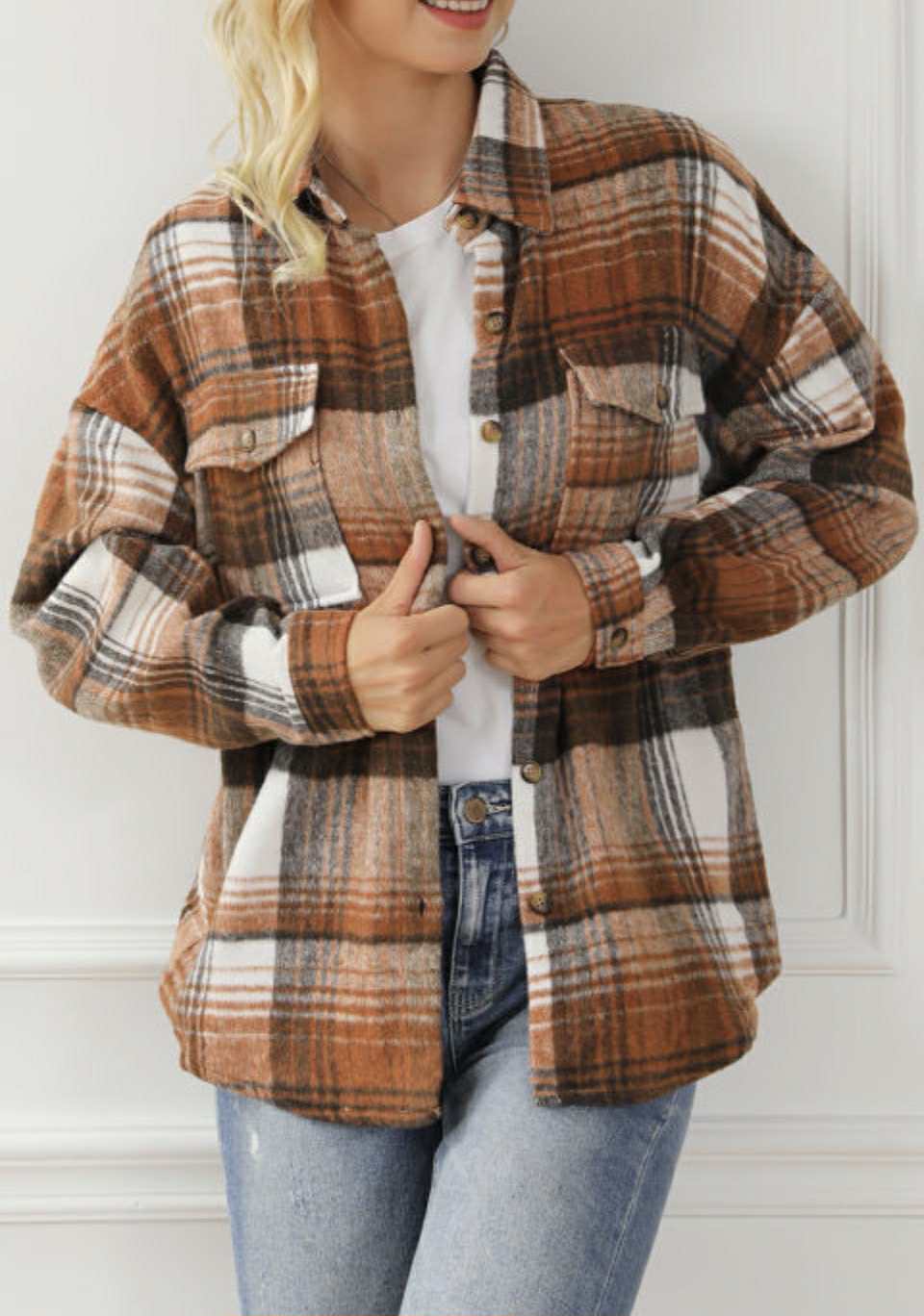Woman wearing WARM IMPRESSIONS BUTTON DOWN shacket, holding a coffee cup in a stylish cafe setting.