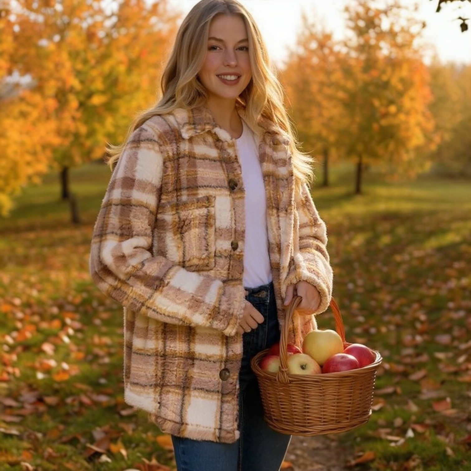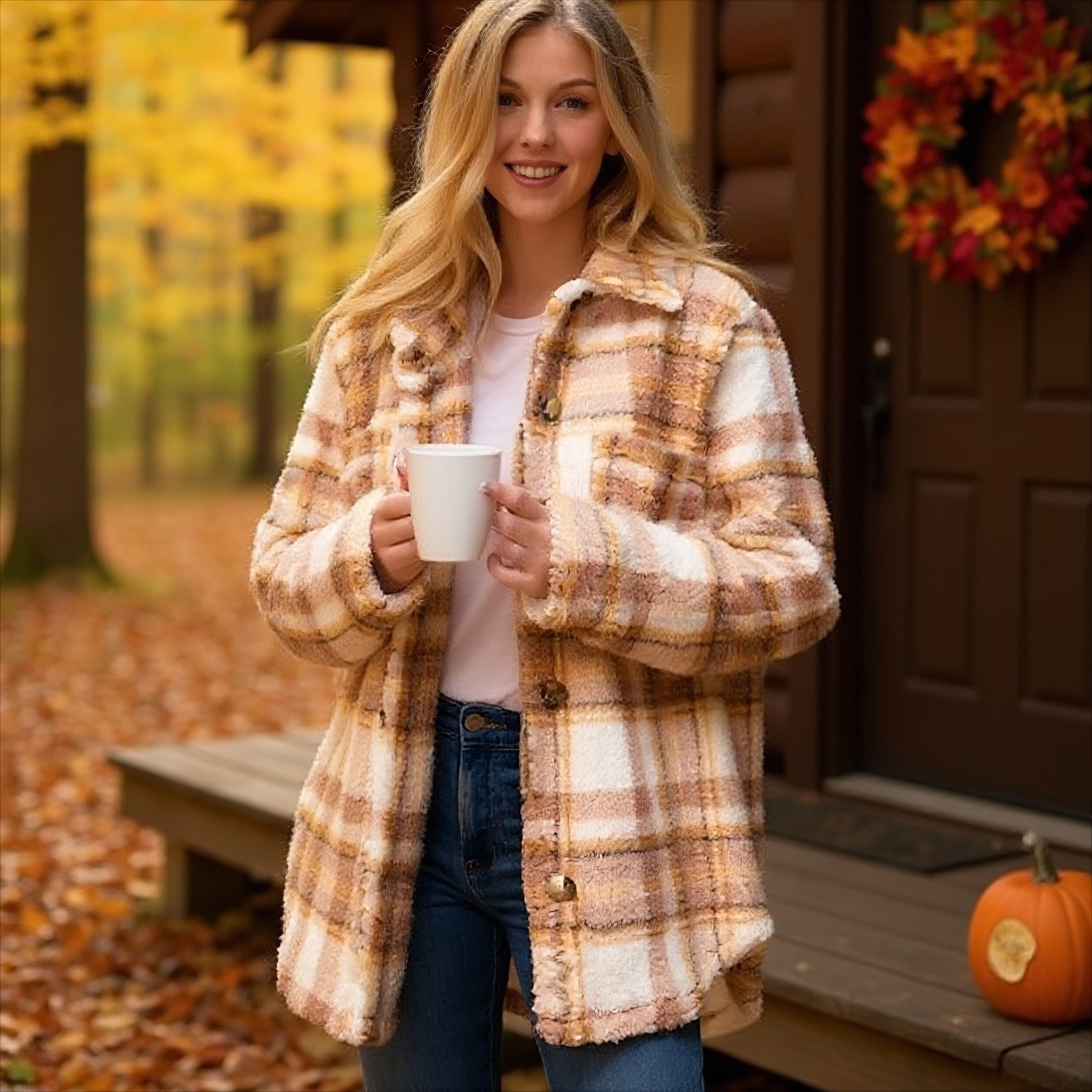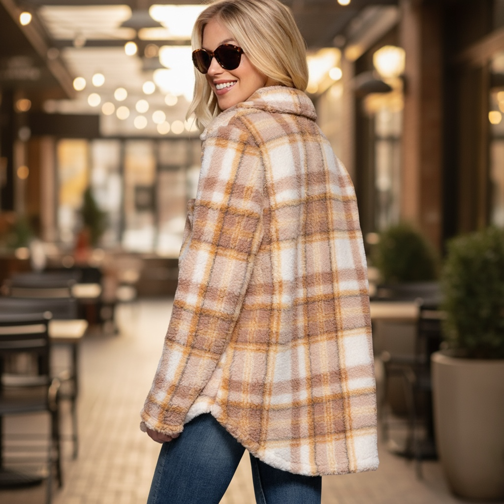 Wrap yourself in cozy autumn comfort with our Harvest Hues Jacket — a soft, oversized plaid sherpa that’s made for pumpkin patch strolls and fireside nights. The neutral tones blend effortlessly with your fall wardrobe, while the plush fabric keeps you feeling snug and stylish all season long.