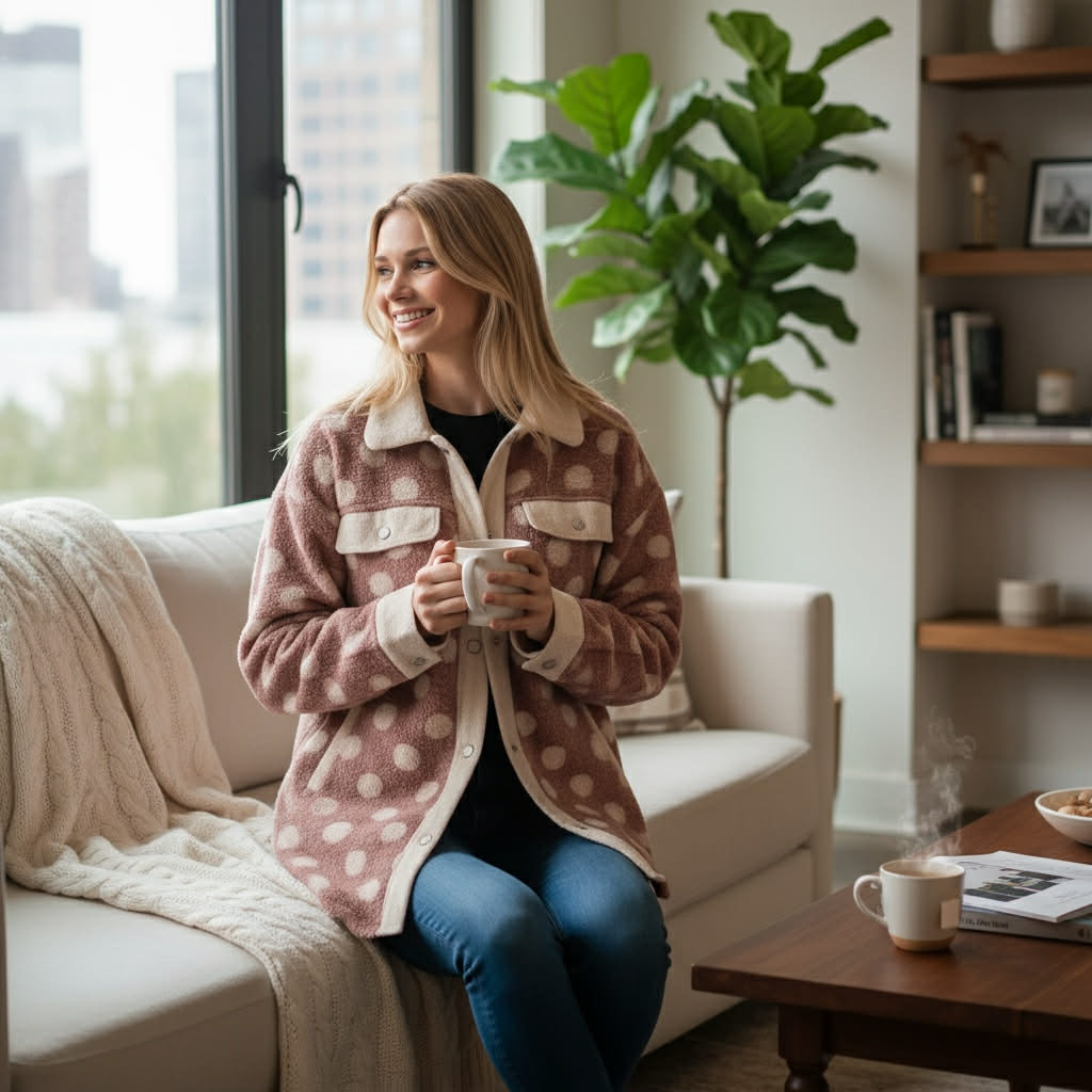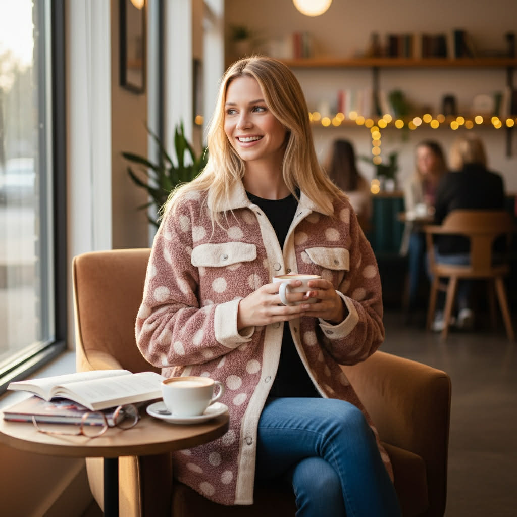 Get ready to snuggle into the coziest layer of the season! The Sweet Spot Sherpa Jacket by BiBi blends soft sherpa warmth with playful polka-dot charm and classic corduroy trim. Designed with an oversized fit, this jacket is perfect for chilly mornings, coffee runs, and all your cozy-cute fall and winter outfits. ☕❄️💗