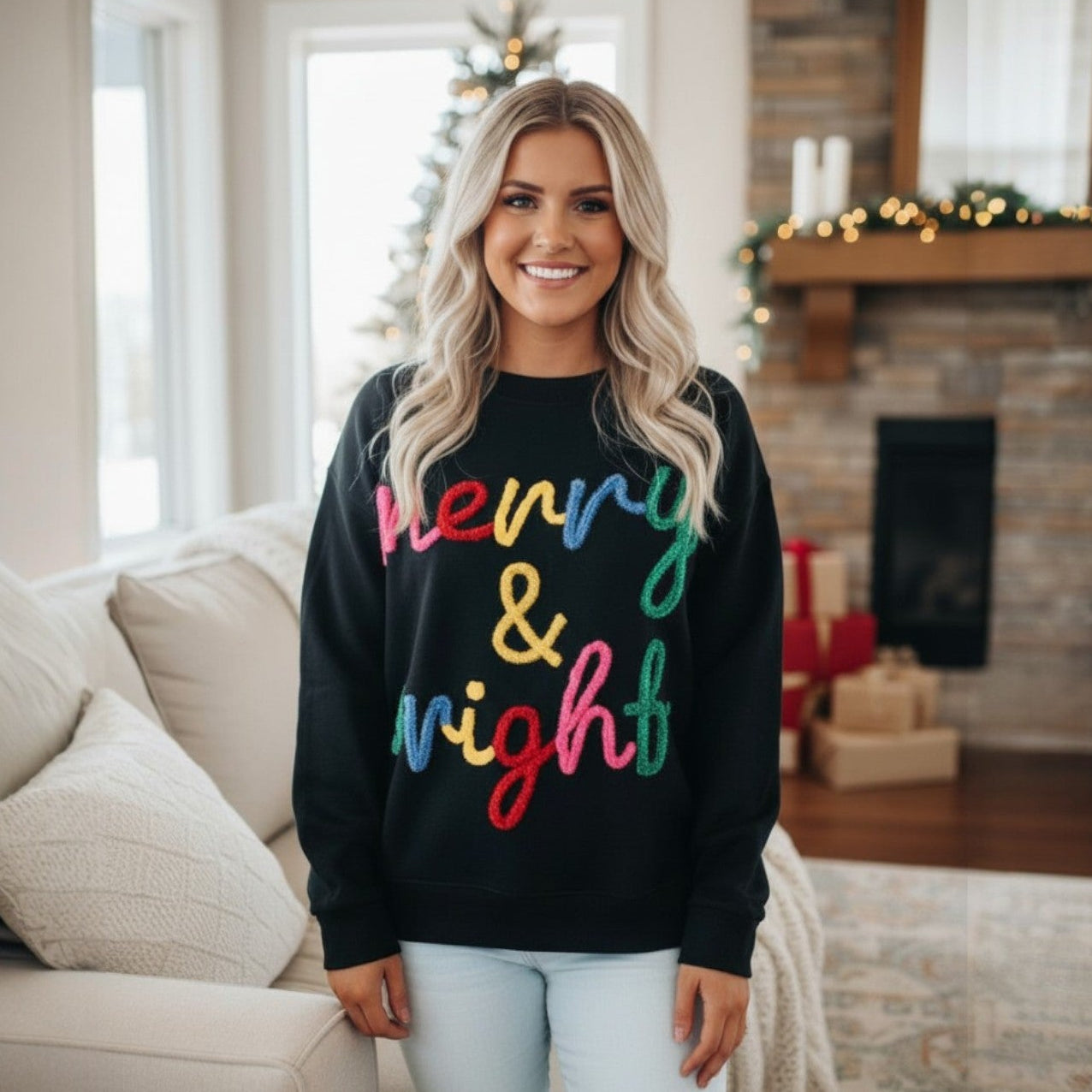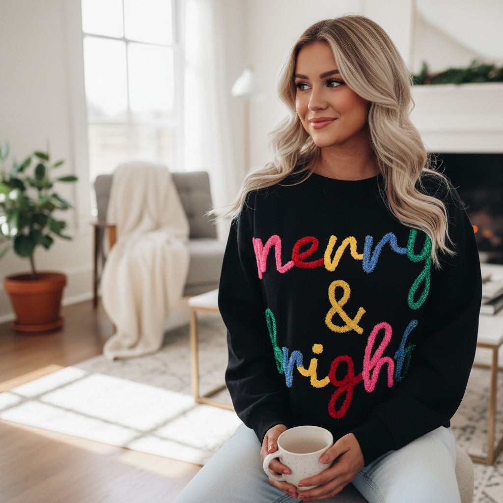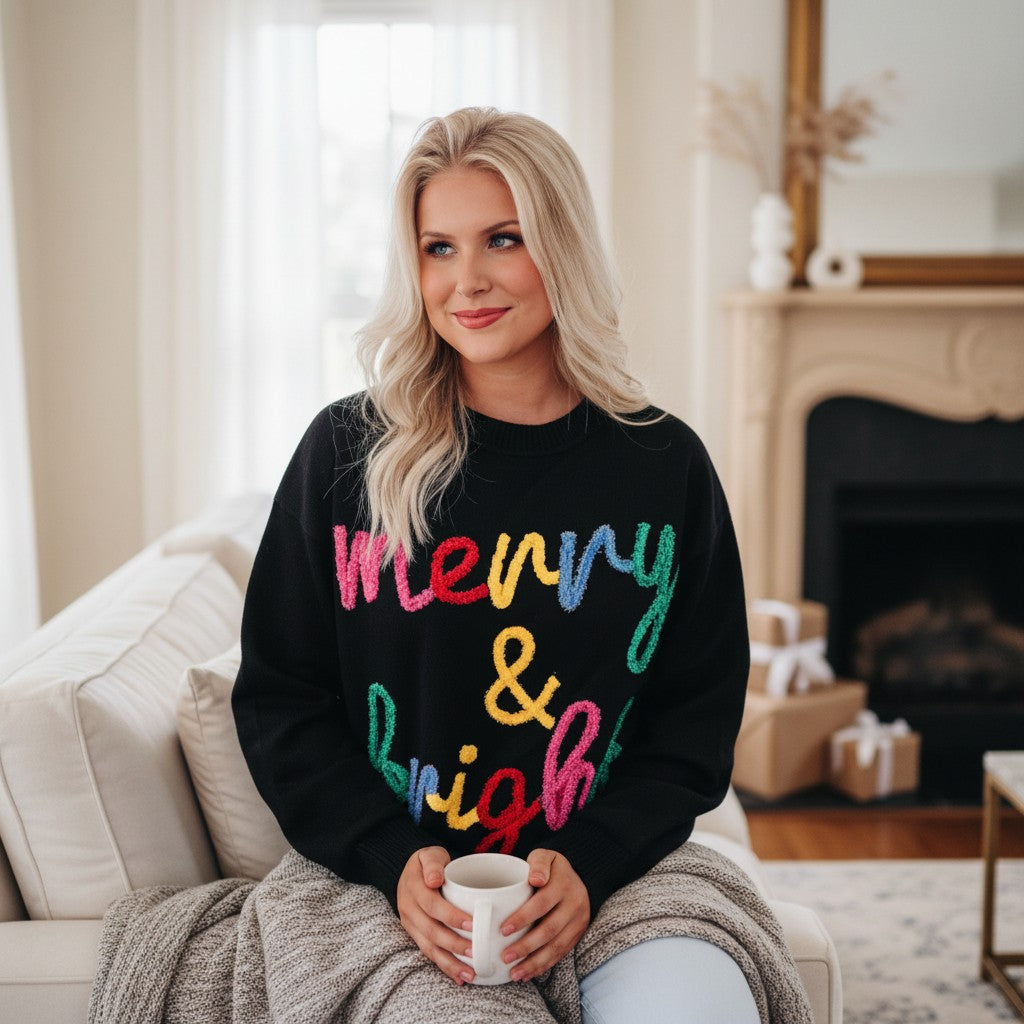 Model wearing STARSTRUCK SWEATER showing bright pink star and colorful striped edges.