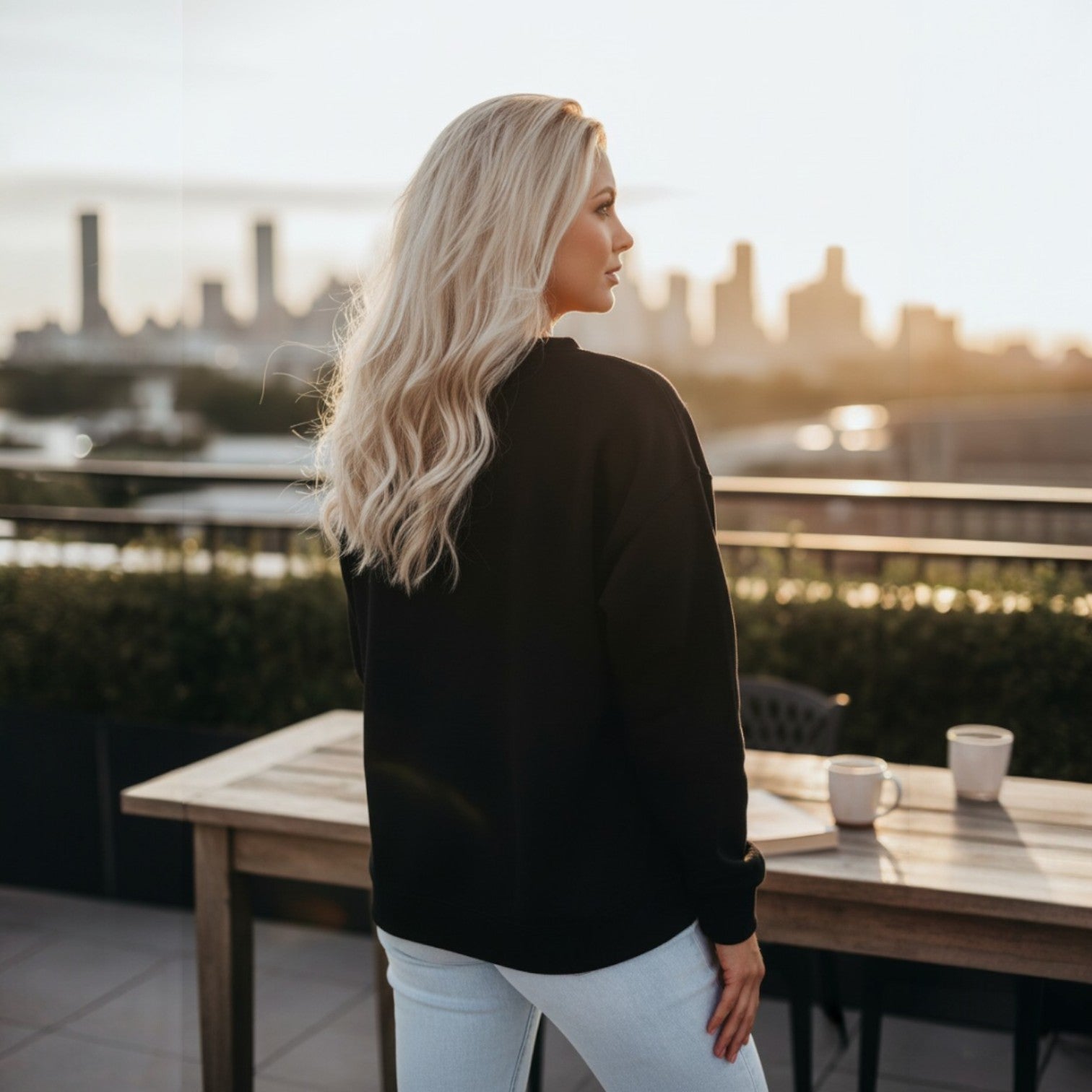 Model wearing UNTAMED AUTUMN SWEATER in a city, showcasing a cute and comfy outfit with high/low hemline.