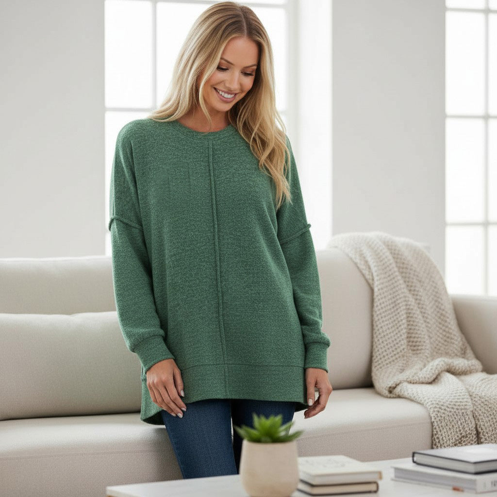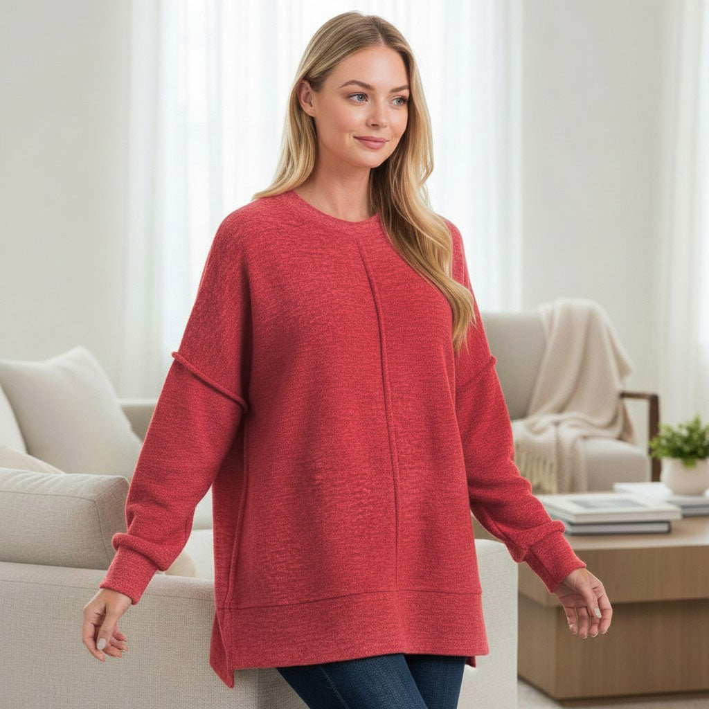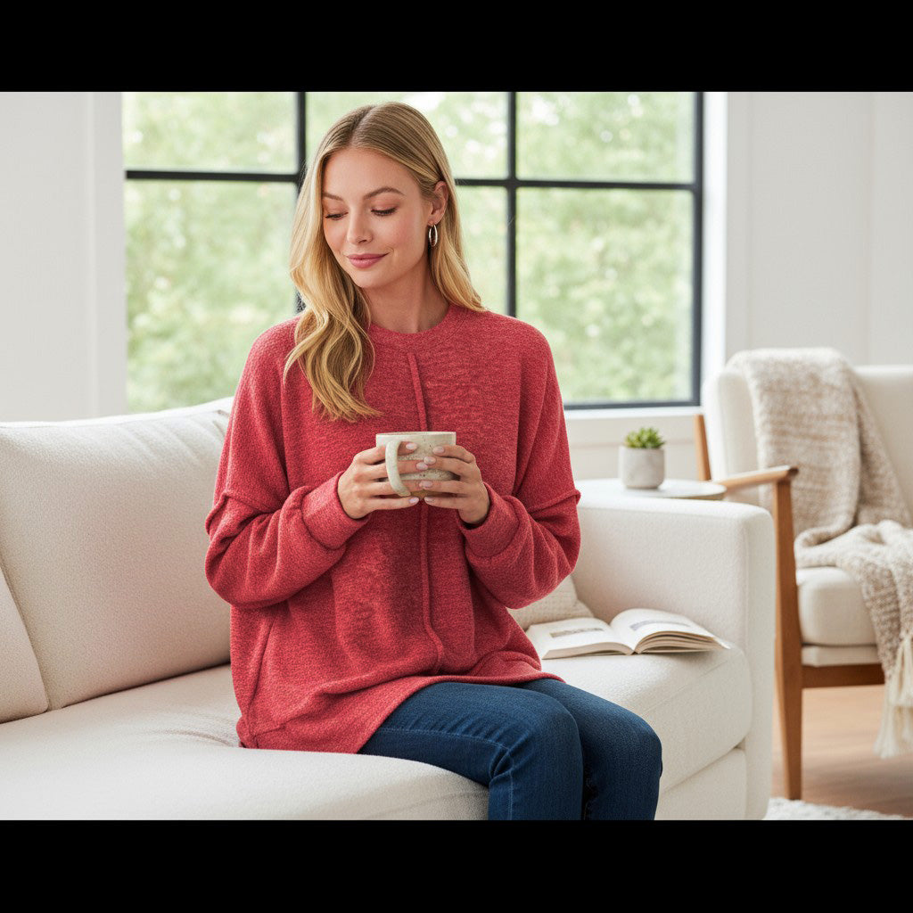 Model wearing the SWEET HAVEN TOP in pink, showcasing a relaxed fit and cozy design with a hi-low hem.