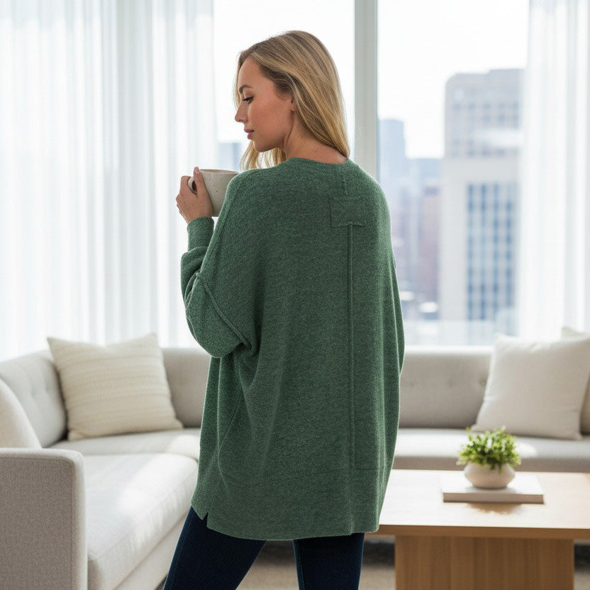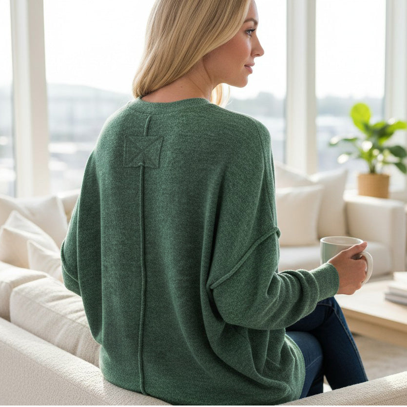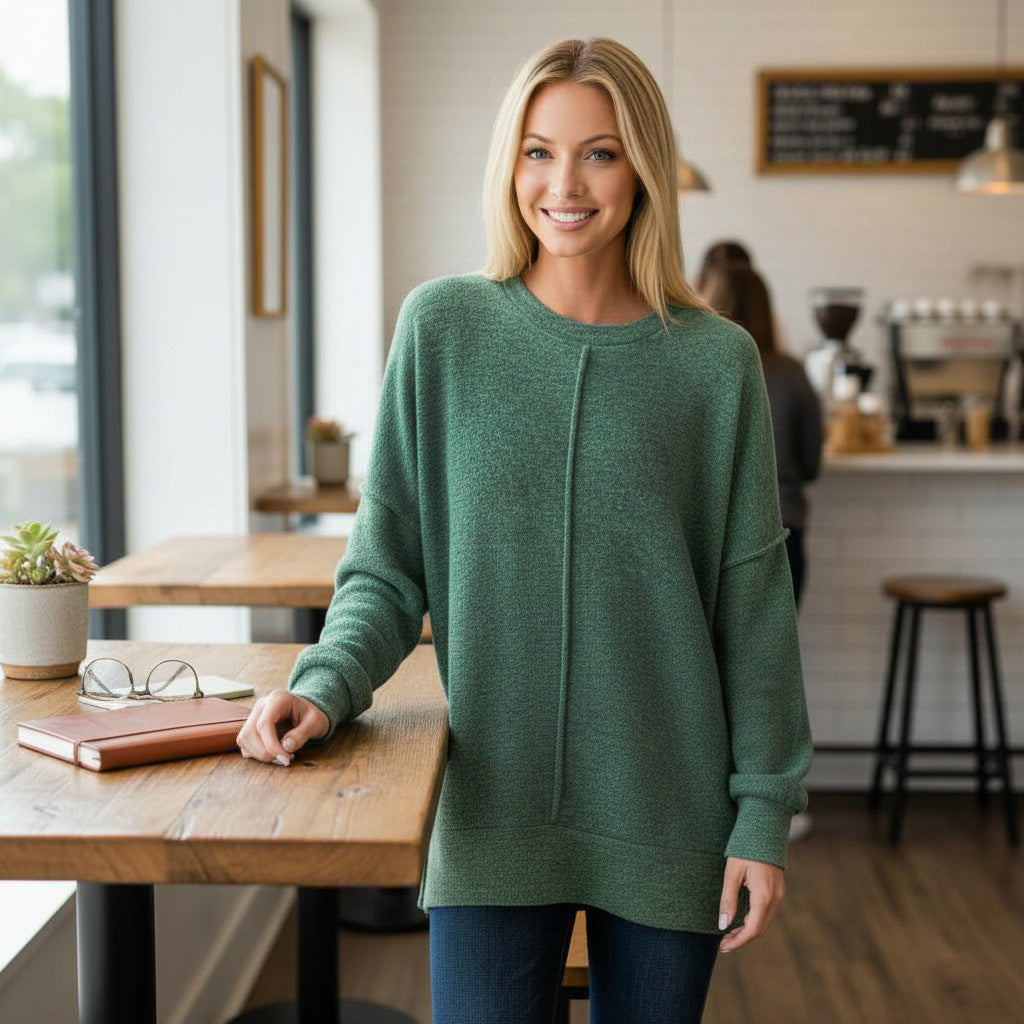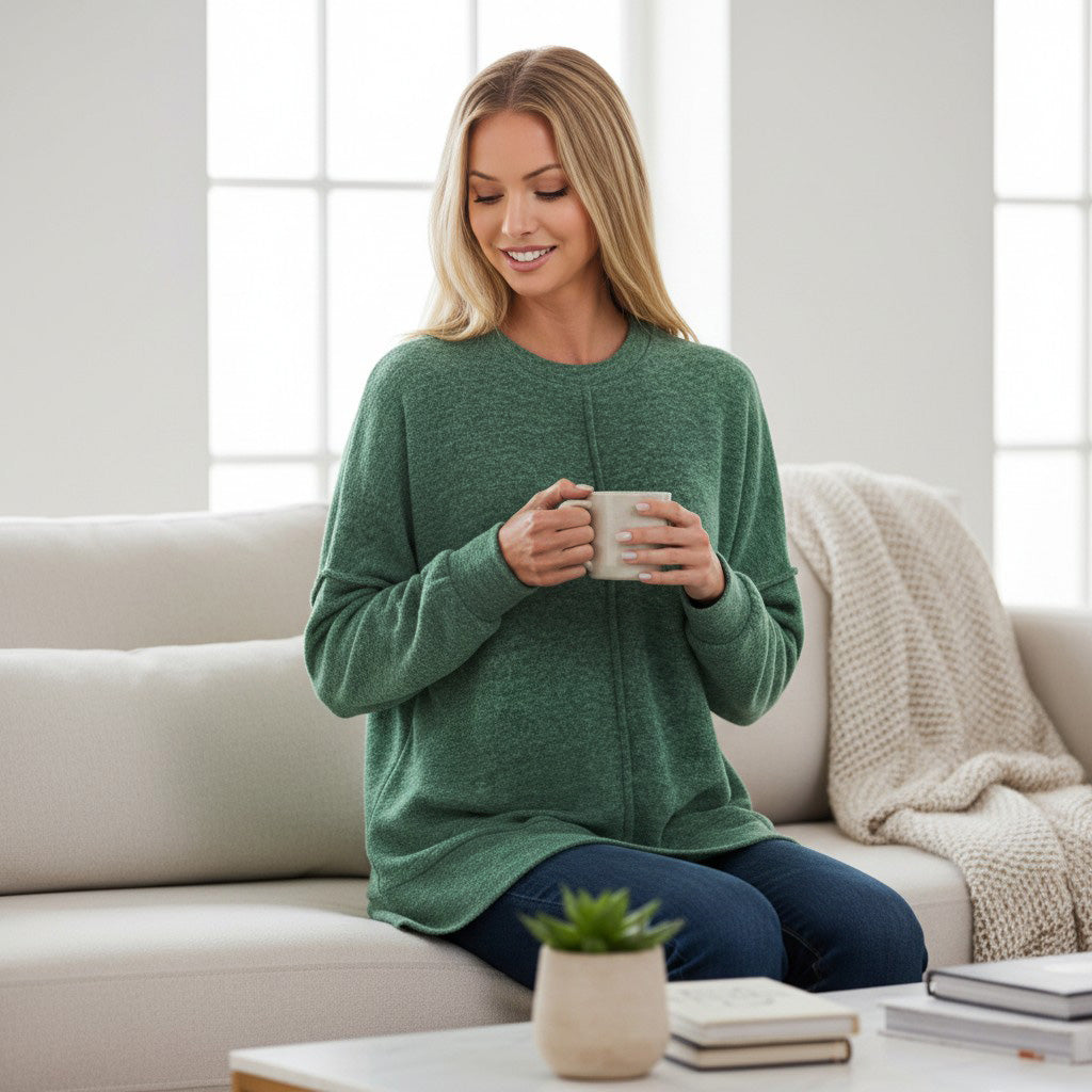 Model wearing the SWEET HAVEN TOP in pink, showcasing a relaxed fit and cozy design with a hi-low hem.