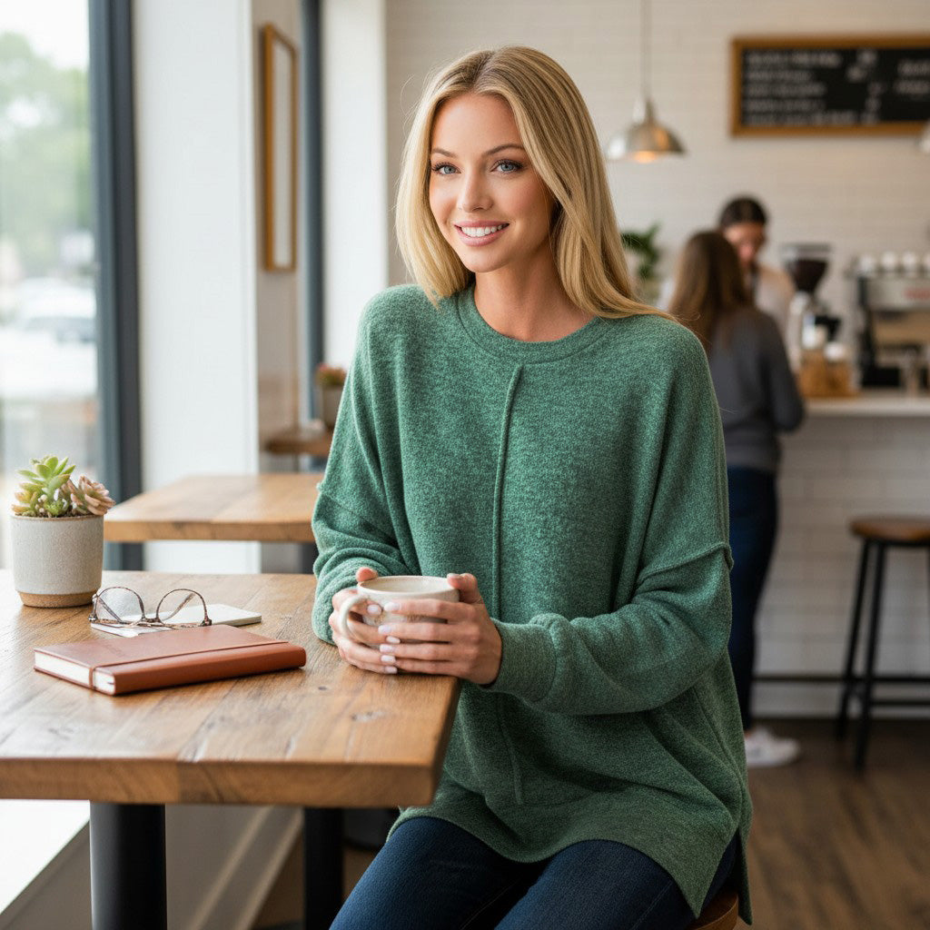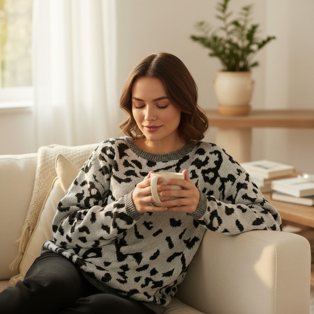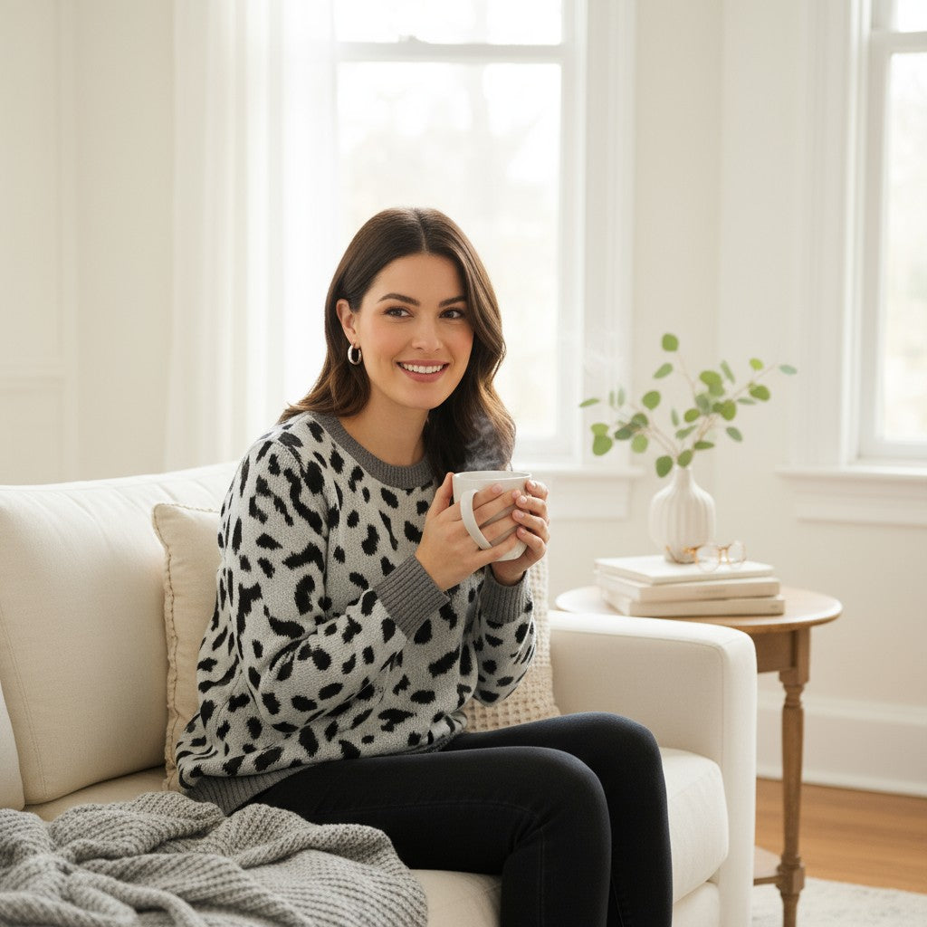 Woman enjoying coffee while wearing the UNTAMED AUTUMN SWEATER with animal print design by Umgee.