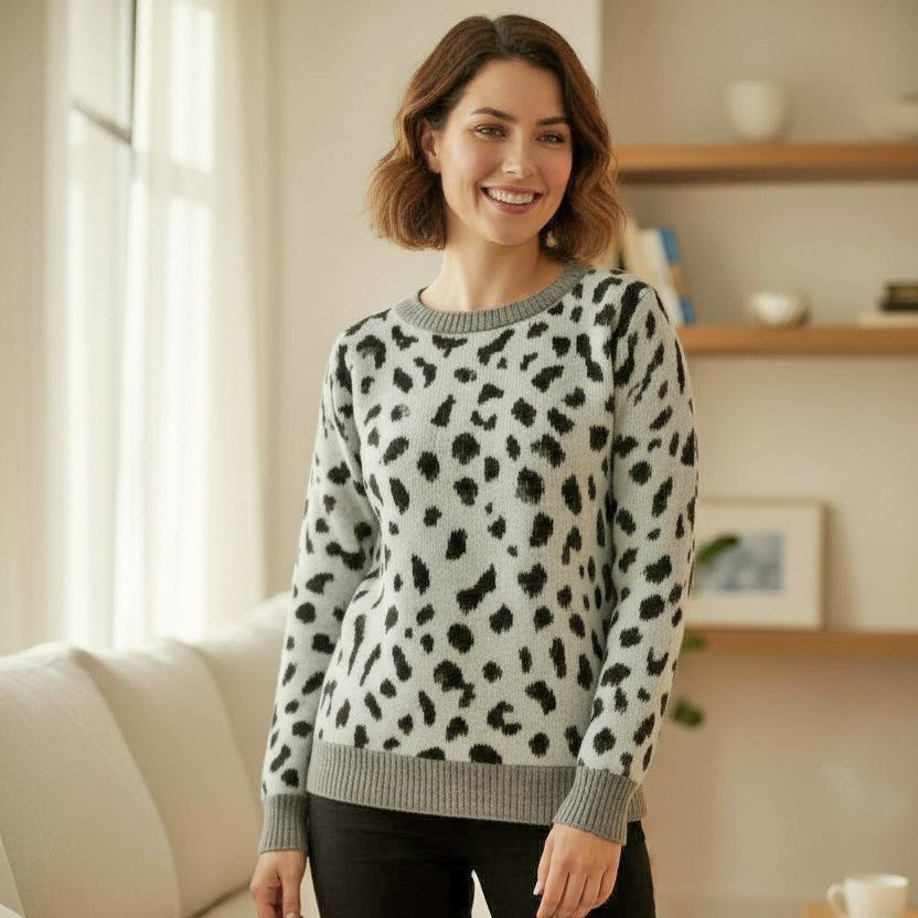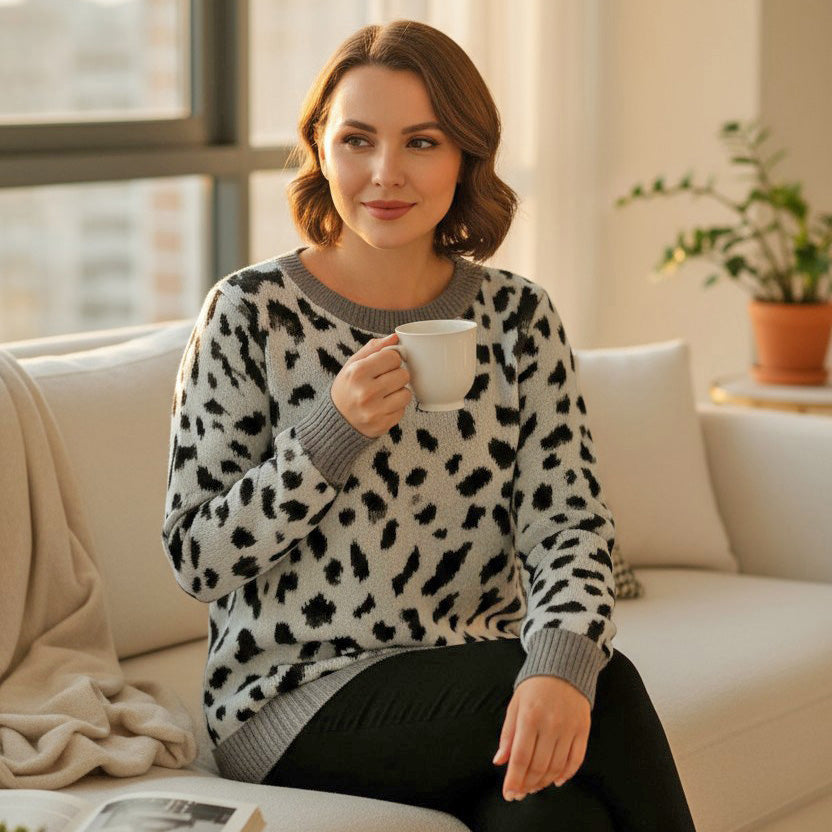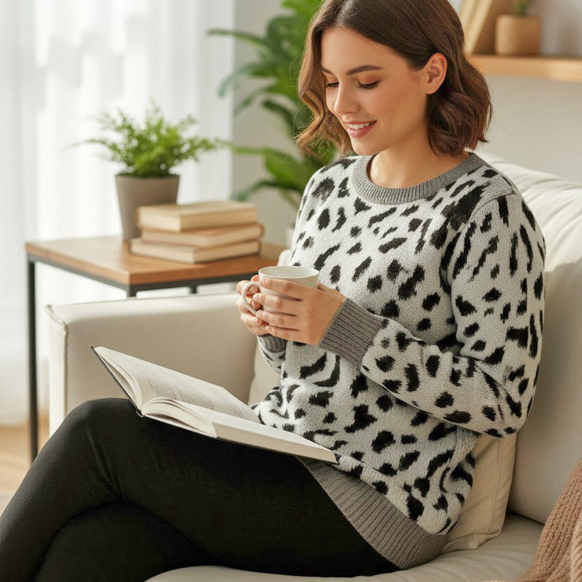 Model wearing UNTAMED AUTUMN SWEATER with animal print and lightweight comfort, showcasing a super cute and comfy style.