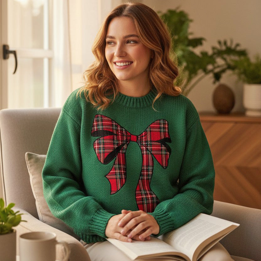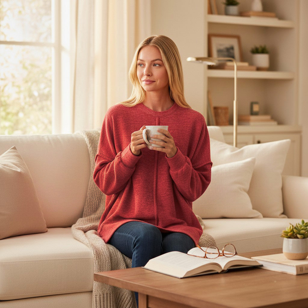 Model wearing UNTAMED AUTUMN SWEATER by Umgee, sitting in a cozy room, reading, showcasing its super cute and comfy style.